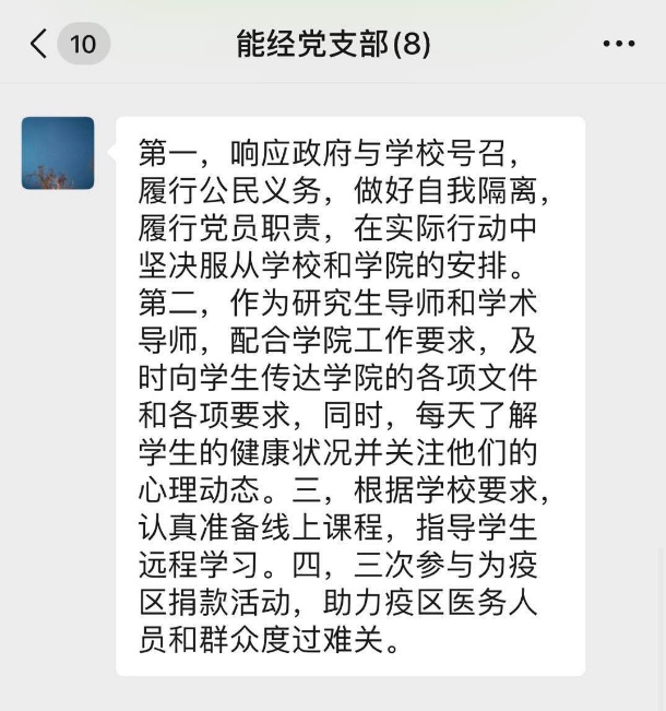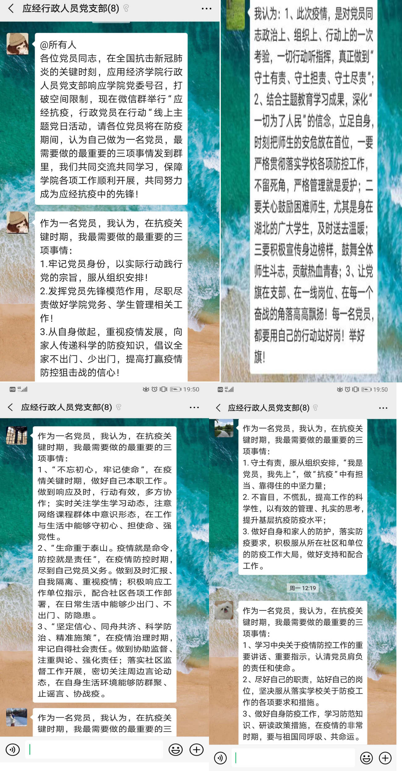 2月25日,在全国抗击新冠肺炎的关键时刻,探花视频 行政人员党支部响应学院党委号召,打破空间限制,在微信群中开展“应经抗疫,行政党员在行动”线上主题党日活动,全体党员参与本次活动。每位党员都结合自己的工作和生活谈了自己的认识与感触,共同交流共同学习,保障学院各项工作顺利开展,共同努力成为应经抗疫中的先锋。大家纷纷发言,众志成城,希望用实际行动为学院、为学校、为国家的防疫工作做出应有的贡献!