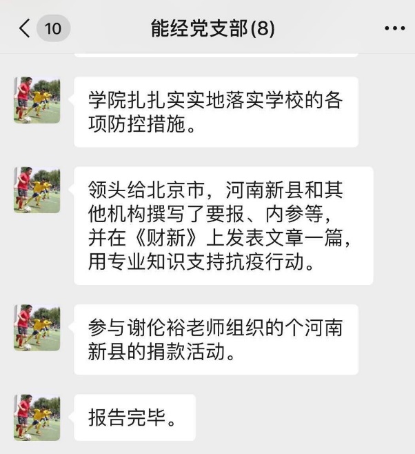河南新县是我院可持续发展课题组的重要教学与科研基地,受本次疫情影响十分严重。支部郑新业同志、谢伦裕同志充分发挥智囊作用,先后多次到新县调研,与老区人民结下了深厚的友谊,积极号召课题组师生,为河南新县献爱心,支部多名教师参与此次捐款活动。支部党员同志还积极为北京市和河南新县等单位撰写要报、内参,以专业知识支持抗疫行动。