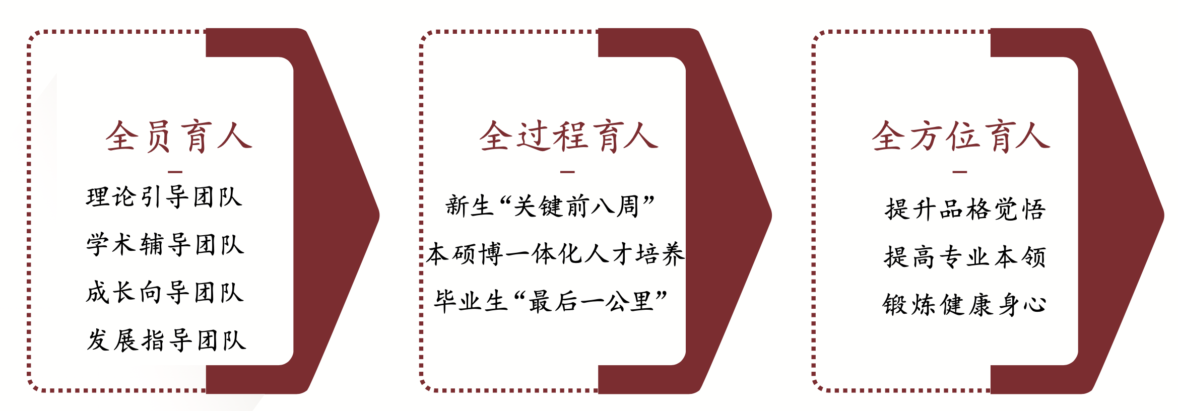 学院为每一位学生配备学术导师,为每一位大一新生配备成长导师,实现本科生导师全覆盖。学院建立“全员育人、全程育人、全方位育人”协同育人机制:搭建“理论引导团队”“学术辅导团队”“成长指导团队”“发展向导团队”,明确“四位一体”的全员育人体系;从入学教育的“关键前八周”,到毕业生的“学位授予”,聚焦品格觉悟、专业本领、健康身心,践行全过程、全方位的培养机制。