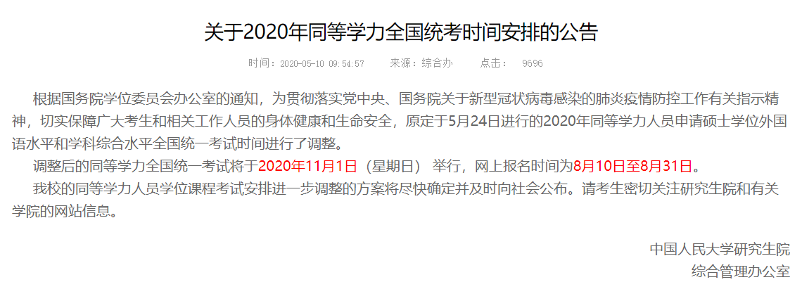 关于2020年同等学力全国统考时间安排的公告