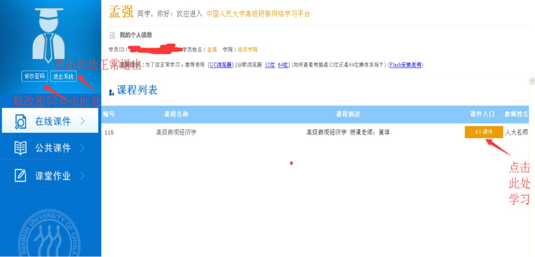 2、点击学员入口登陆,输入账号密码,用户名为本人身份证号码,登录密码默认为123456789,登录后立即自行修改密码。