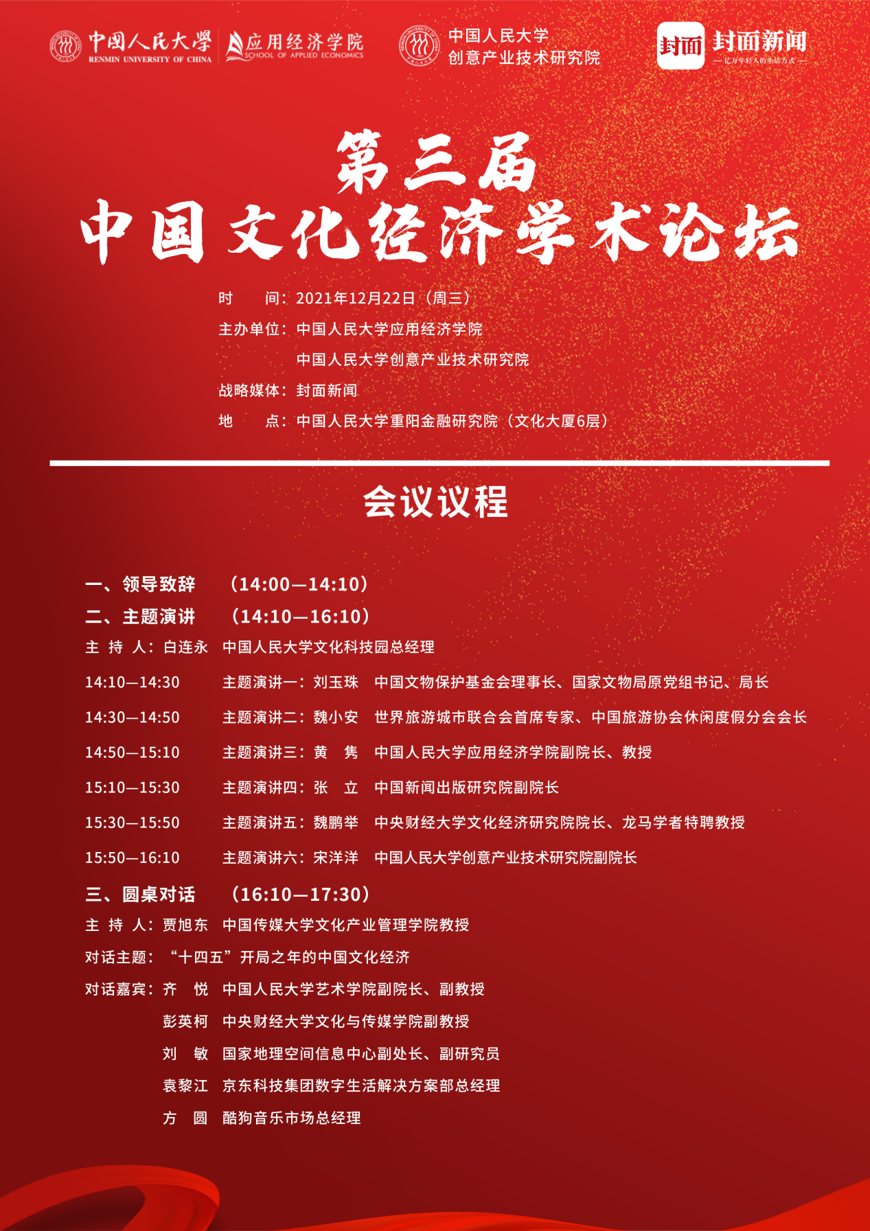 为推动中国文化经济问题的研究和交流,由探花视频 和中国人民大学创意产业技术研究院共同主办的第三届中国文化经济学术论坛将于2021年12月22日在北京举行。