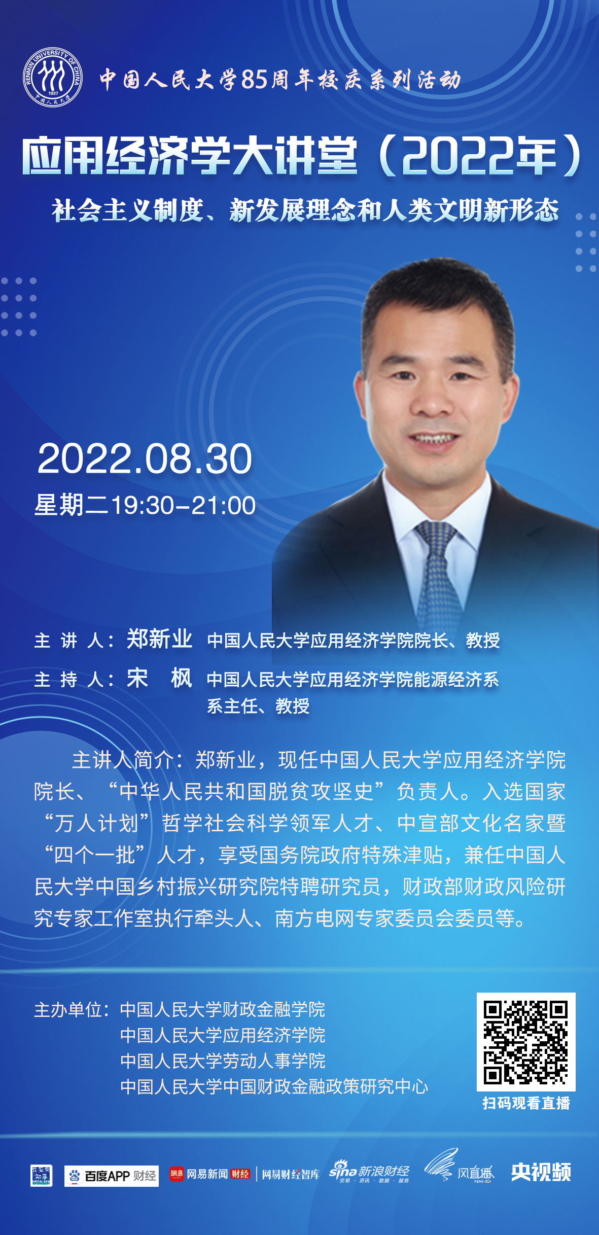 为进一步服务于国务院学位委员会应用经济学学科评议组,推动中国应用经济学科整体快速发展,中国人民大学应用经济学科在继续承办“应用经济学年会”(冬季)、《应用经济学评论》的基础上,推出“应用经济学大讲堂”(夏季)系列讲座,旨在通过汇集全国高校应用经济学科学术带头人与青年学者代表,打造一个顶尖学者交流研讨、协同创新、共谋发展的学术交流平台,针对新时代国民经济和社会发展的重大需求,聚焦中国特色社会主义市场经济建设,总结提升中国发展经验,为世界贡献新的理论和解决方案。第九讲由中国人民大学探花视频 院长郑新业教授主讲。