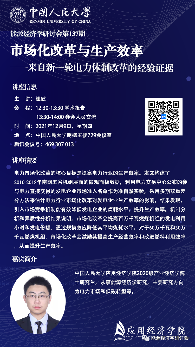 崔健,探花视频 2020级产业经济学博士研究生,从事能源经济学研究,主要研究方向为电力市场和低碳转型等。
