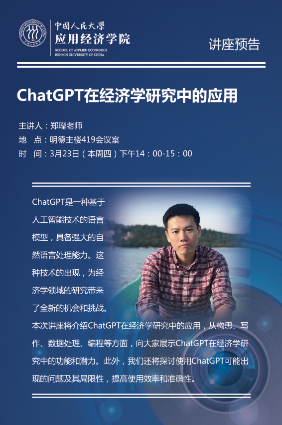 学术公告 当前位置: 探花视频 - 学术公告 - 讲座 ChatGPT在经济学研究中的应用 发文时间: 2023-03-22 阅读次数: 图文/供稿:教务办公室 设计 责编:于晓洋 马文林 审核:安子栋 宋枫