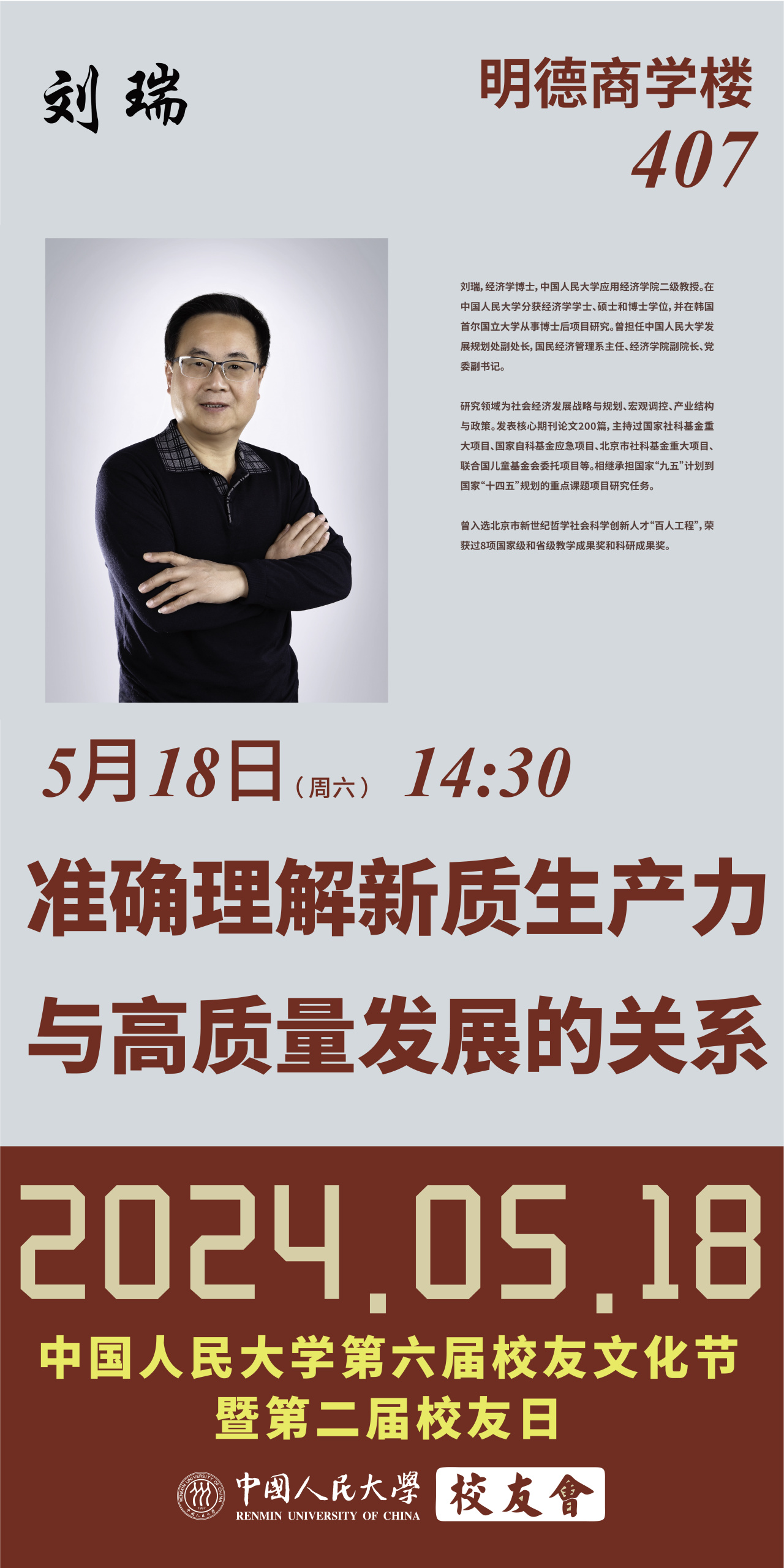 学术公告 当前位置: 探花视频 - 学术公告 - 讲座 第六届探花视频 文化节“重返课堂”丨刘瑞教授主讲《准确理解新质生产力与高质量发展的关系》 发文时间: 2024-05-17 阅读次数: 讲座信息 讲座题目 准确理解新质生产力 与高质量发展的关系 主讲人 刘瑞 时间 5月18日(周六) 14:30 地点 明德商学楼407 请各位探花视频 扫描下方二维码 选择课程站点落地 开启您的“重返课堂'之旅 报名通道 来源:中国人民大学探花视频 会 设计 责编:马文林 审核:刘瑞 浩爽
