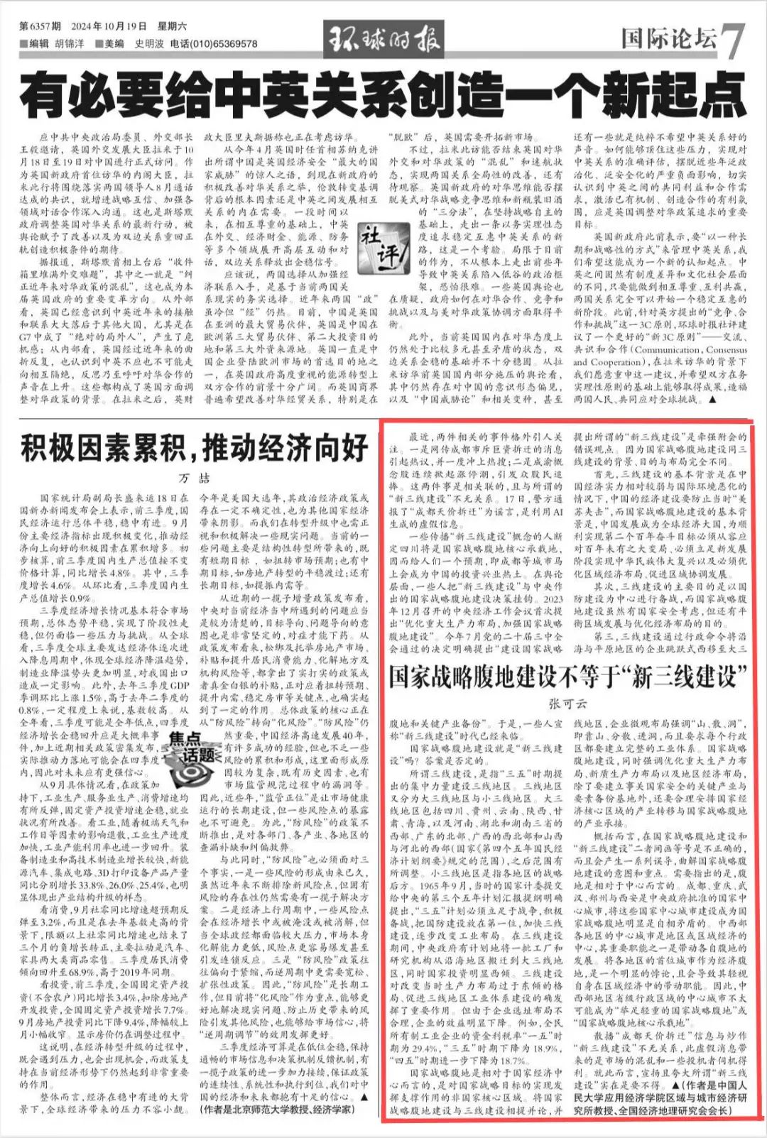 一些传播“新三线建设”概念的人断定四川将是国家战略腹地核心承载地,因而给人们一个预期,即成都等城市马上会成为中国的投资兴业热土。在舆论层面,一些人把“新三线建设”与中央作出的国家战略腹地建设决策挂钩。2023年12月召开的中央经济工作会议首次提出“优化重大生产力布局,加强国家战略腹地建设”。今年7月党的二十届三中全会通过的决定明确提出“建设国家战略腹地和关键产业备份”。于是,一些人宣称“新三线建设”时代已经来临。