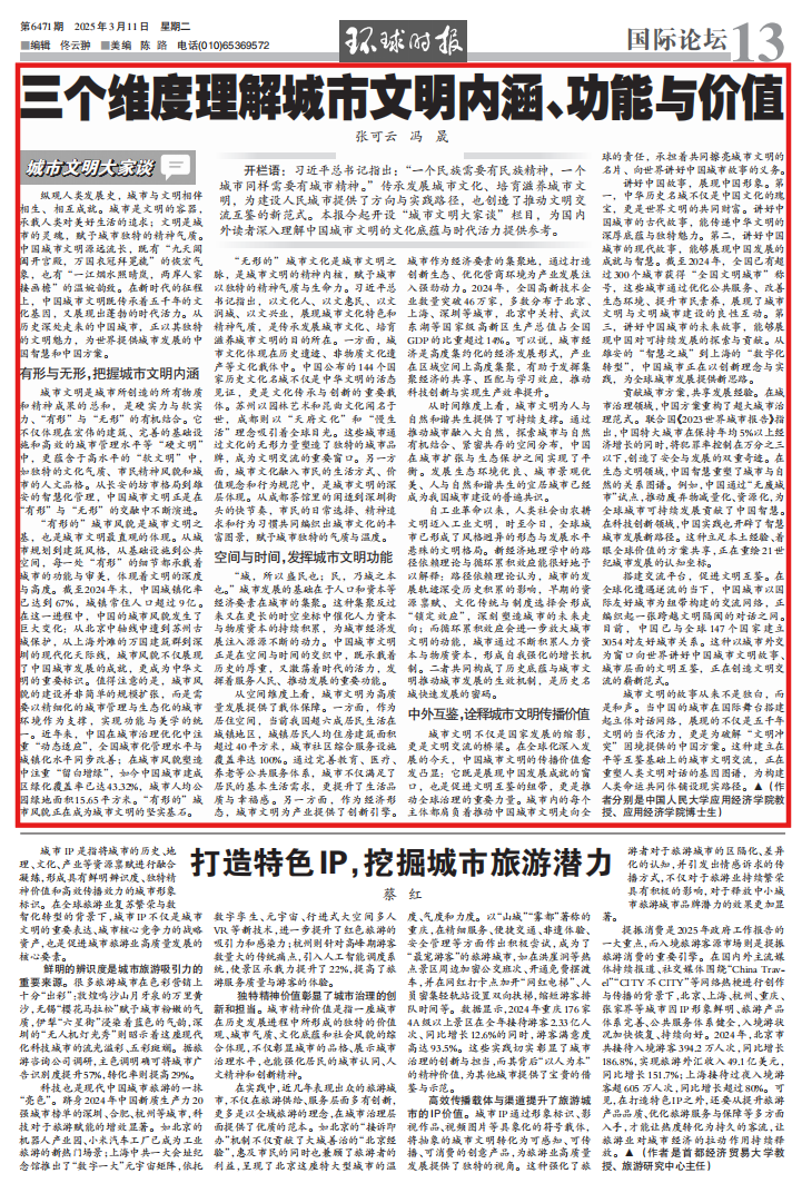 开栏语:习近平总书记指出:“一个民族需要有民族精神,一个城市同样需要有城市精神。”传承发展城市文化、培育滋养城市文明,为建设人民城市提供了方向与实践路径,也创造了推动文明交流互鉴的新范式。本报今起开设“城市文明大家谈”栏目,为国内外读者深入理解中国城市文明的文化底蕴与时代活力提供参考。