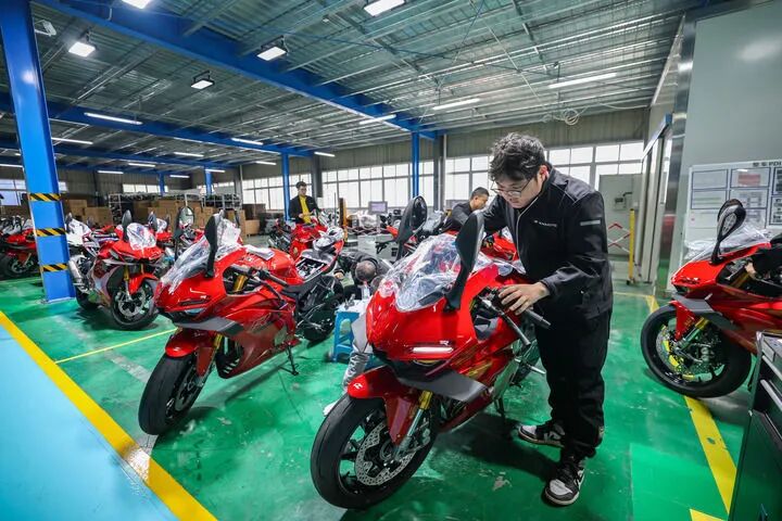 ▲2026年4月1日,工作人员在重庆两江新区“张雪机车”生产车间对下线整车进行入库发车检测。新华社记者 黄伟 摄