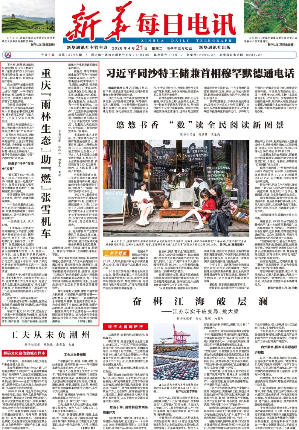 “一位湖南小伙、一片重庆热土、一笔浙江的投资,把中国摩托车推向了国际大赛的冠军”“重庆产发动机、广东出头盔、江苏造连杆、山东供应曲轴……造就了世界最快的摩托车之一”……