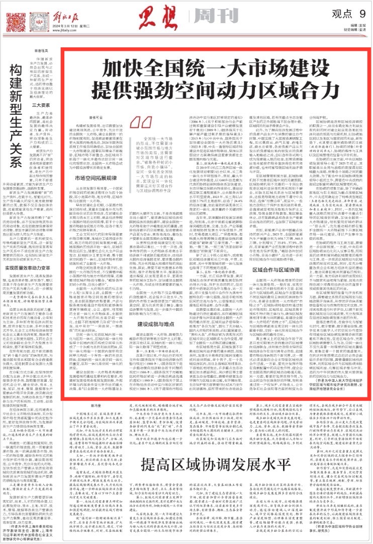 构建新发展格局,迫切需要加快建设高效规范、公平竞争、充分开放的全国统一大市场,建立全国统一的市场制度规则,促进商品要素资源在更大范围内畅通流动。2024年国务院政府工作报告明确提出,加快全国统一大市场建设。随着区际壁垒不断破除、区域市场不断整合,各区域将不断趋于一体化并最终达到空间一体化的理想状态,全国统一大市场会成为中国经济增长的稳定支撑。