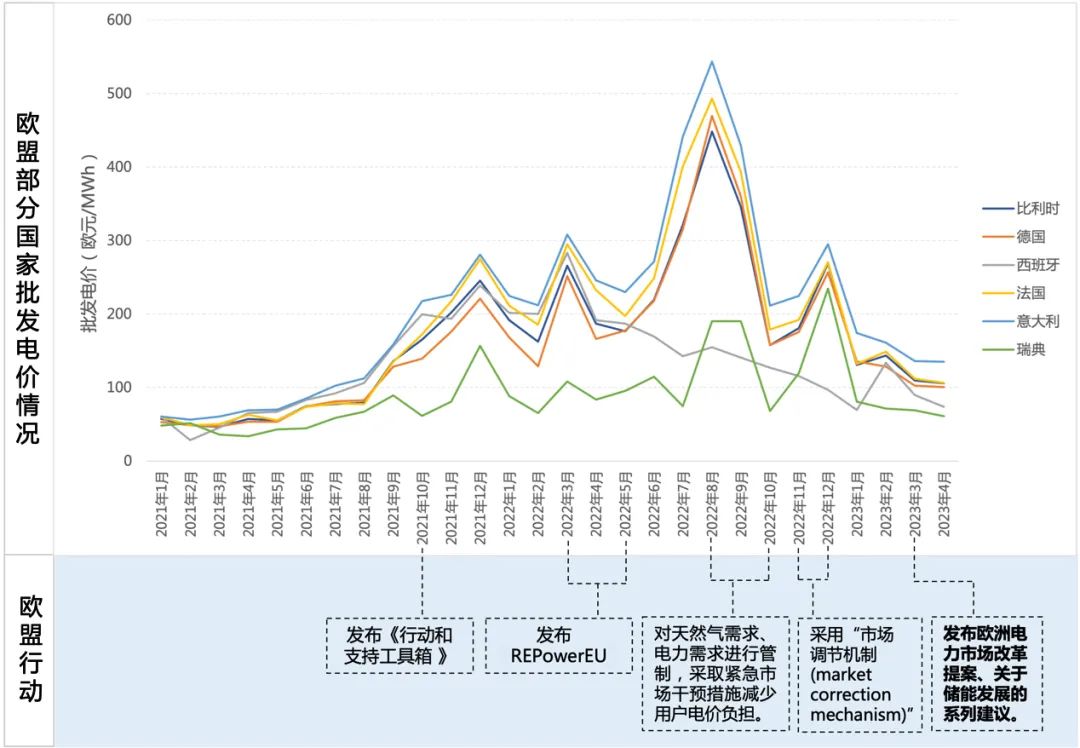 图1 欧洲批发电价情况与欧盟应对行动