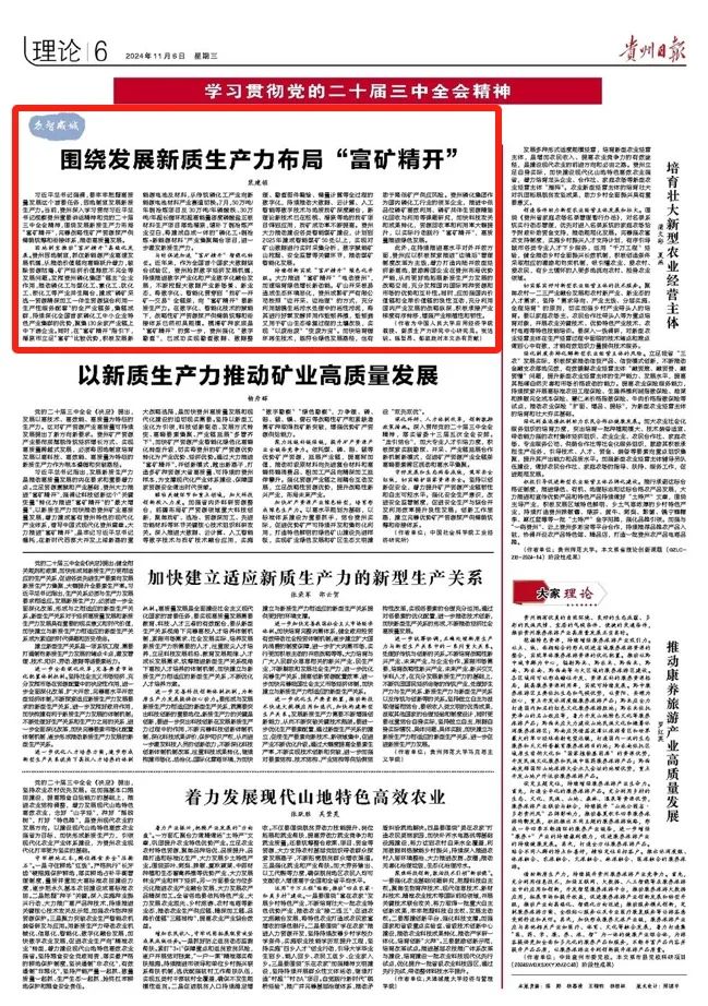 习近平总书记强调,要牢牢把握高质量发展这个首要任务,因地制宜发展新质生产力。当前,贵州深入学习贯彻习近平总书记视察贵州重要讲话精神和党的二十届三中全会精神,围绕发展新质生产力布局“富矿精开”,完善战略性矿产资源探产供储销统筹和衔接体系,推动高质量发展。