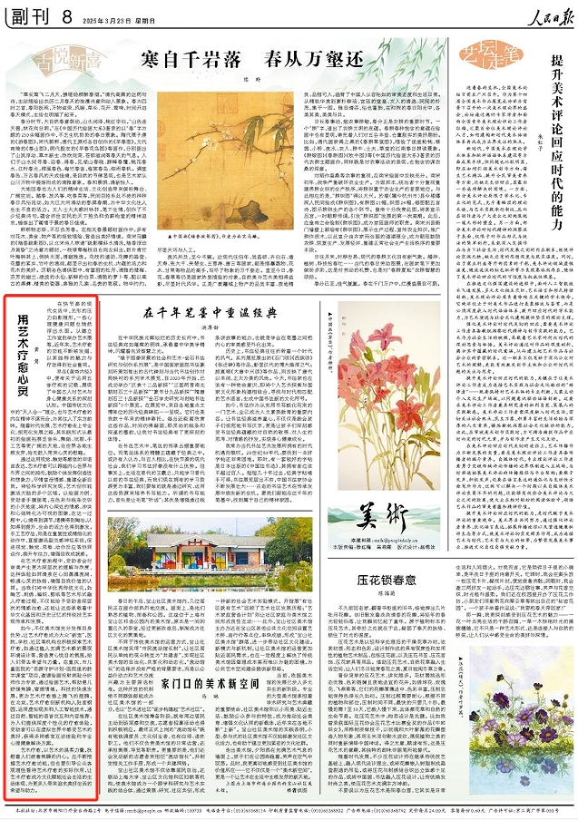 艺术疗愈,以艺术的温柔力量,抚慰着人们疲惫焦躁的内心。应不断挖掘艺术疗愈功能,但也要引导公众客观理性看待艺术疗愈的实际作用,让艺术疗愈成为文化赋能社会生活的生动体现,为更多人带来追求美好生活的希望与助力。