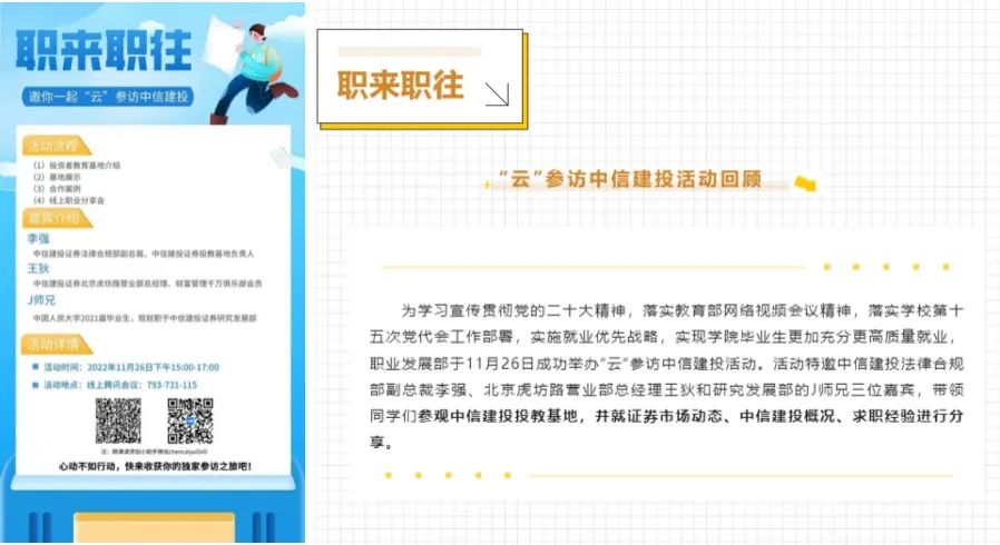 打造“经世导航”“职来职往”系列品牌活动。邀请学院优秀探花视频 、相关企业招聘负责人等举办专场活动,为同学们提供岗位和行业咨询指导、帮助同学们探索适合自己的职业发展路径,有效提高同学们的求职技能。