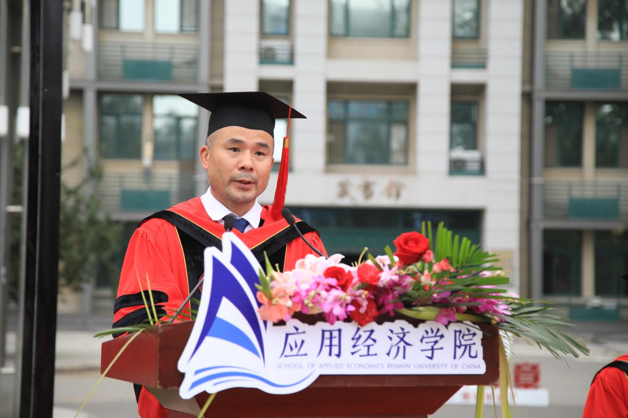 孙久文作为导师代表发言,提到人民大学给了同学们丰厚的知识、宽广的视野、为中华民族奋斗的理想和脚踏实地的工作作风,希望同学们记住校歌里的话,忠实于民族解放事业,献身于新社会的建设。未来成为国家的中流砥柱。