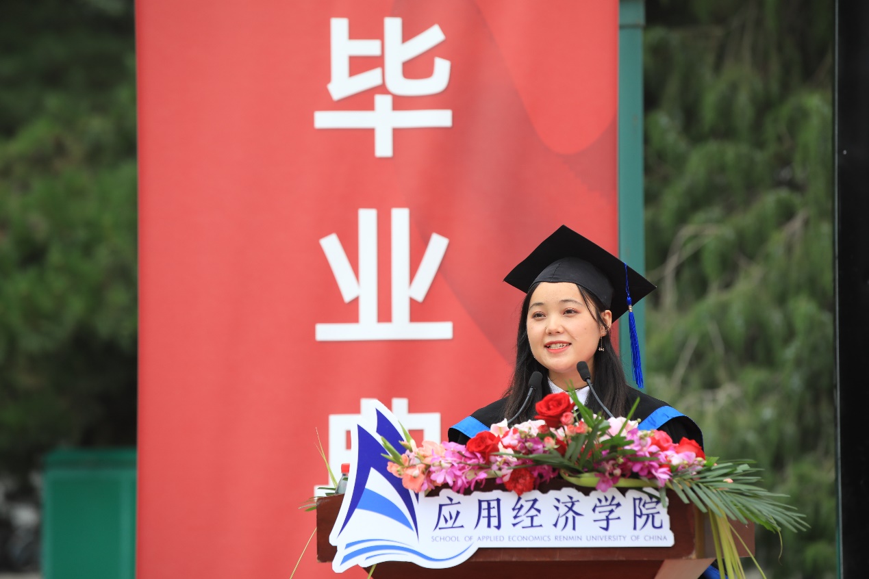 2016级能源经济系马文心作为本科毕业生代表发言,在回顾自己在人大四年的学习生活的同时,表达了对学校、学院、师长和同学的感谢,分享了人大和探花视频 给她带来的朴实、包容、勇敢的宝贵品质。