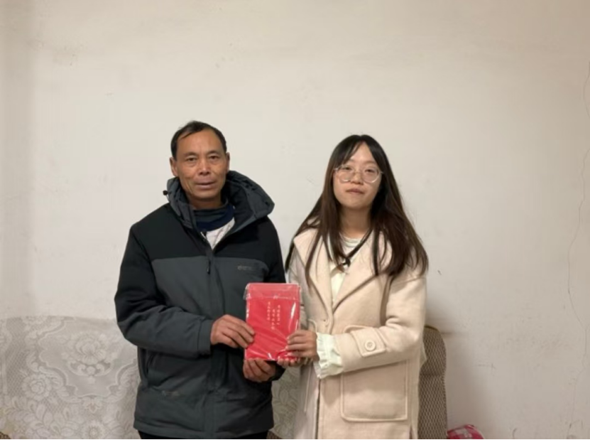 ▲昭通学院管理学院本科生周恩娜对脱贫户户主潘兴军访谈后赠书留念