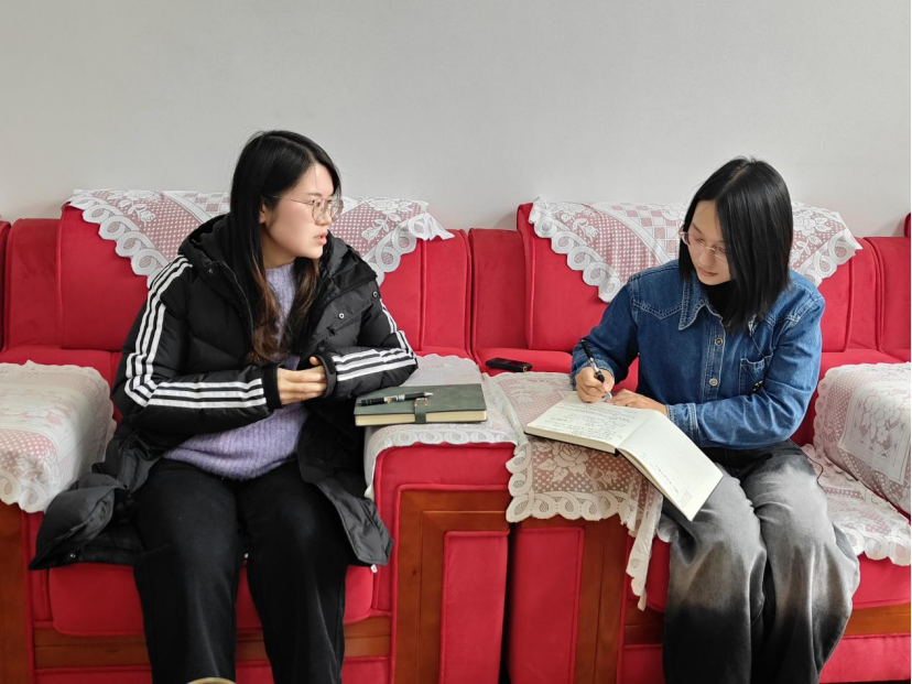 ▲昭通学院管理学院本科生代坦访谈脱贫户户主杨开琴