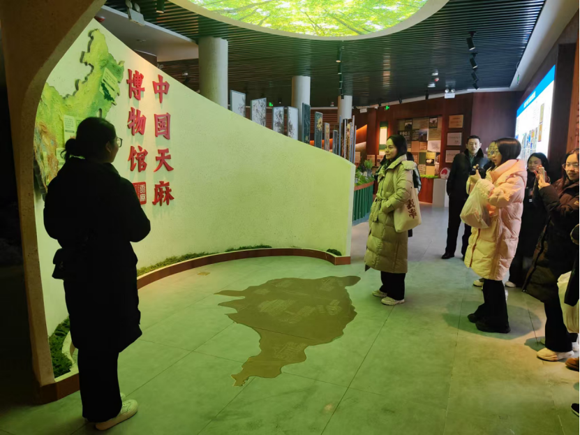 1月14日下午,乌蒙山赤水队到达中国天麻博物馆参观学习。天麻博物馆采用数字化运作系统,运用声、光、电、多媒体和虚拟现实新手段和方法,全面展现天麻的生态景观、植物景观和人文景观,以及小草坝的生态环境、土壤环境和惟妙惟肖的历史人物。整个博物馆以天麻为主题、以五千年天麻药食文化为脉络,深入诠释了天麻的前世今生。