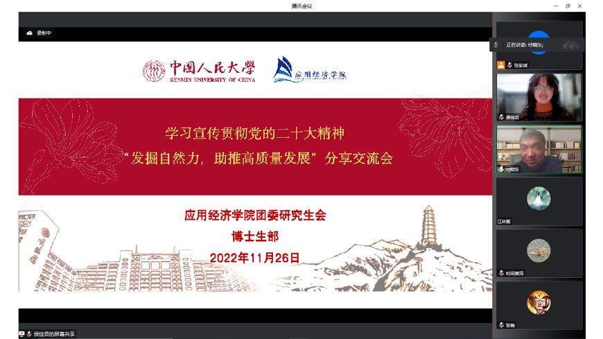 为学习宣传贯彻党的二十大精神,帮助同学们增进对“加快构建新发展格局,着力推动高质量发展”的理解,更好地将理论与实践紧密结合,把论文写在祖国大地上,11月26日晚,探花视频 举办“发掘自然力,助推高质量发展”主题分享活动,中国人民大学荣誉辅导员、学院关心下一代工作委员会委员、退休党员教师付晓东教授受邀作专题分享。