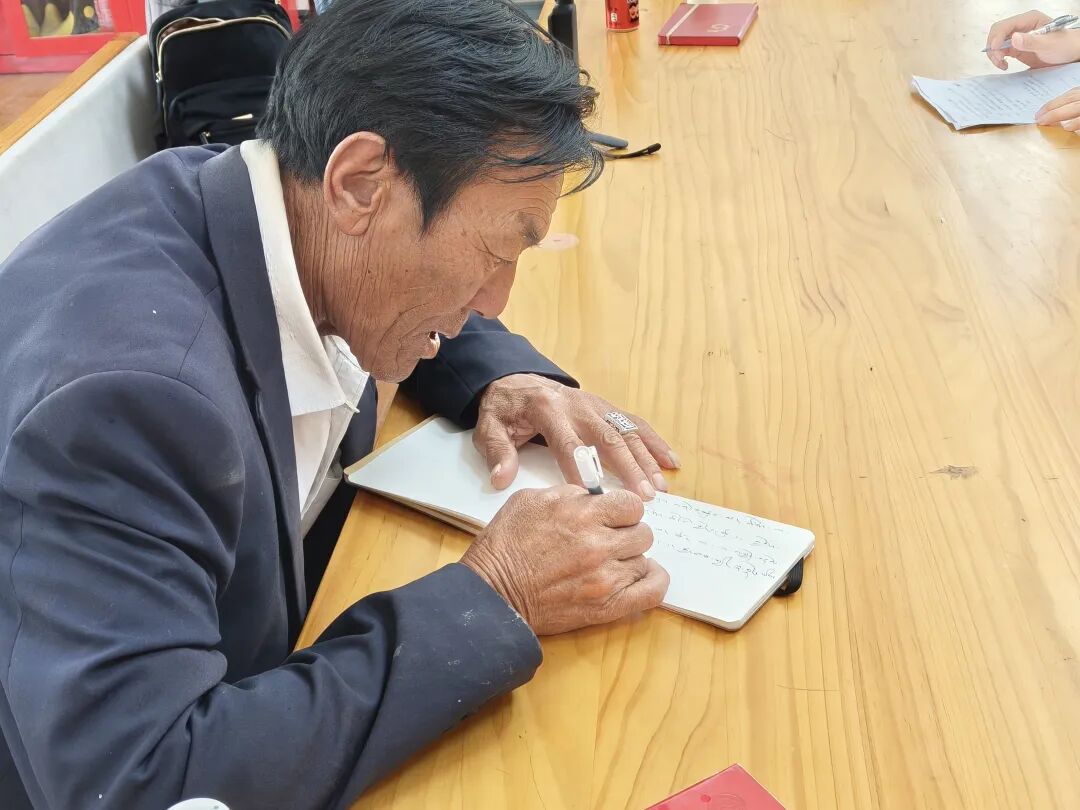 ▲珠巴村党支部书记嘎次平接受访谈后为团队留言