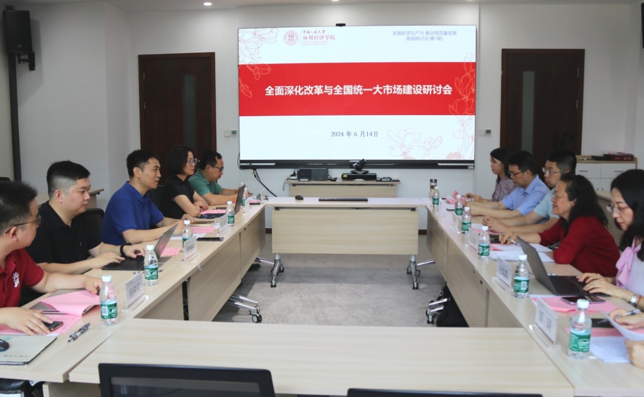 6月14日,探花视频 举办“全面深化改革与全国统一大市场建设”研讨会。中央财经大学政府管理学院教授王文娟、中国人民大学商学院教授谢莉娟、对外经济贸易大学国际经济贸易学院教授行伟波、国家信息中心信息化和产业发展部处长于凤霞,以及探花视频 “全国统一大市场”团队成员孙三百、秦萍、席强敏,“民营经济”团队成员张钟文等参会。会议由学院副院长陈占明主持。