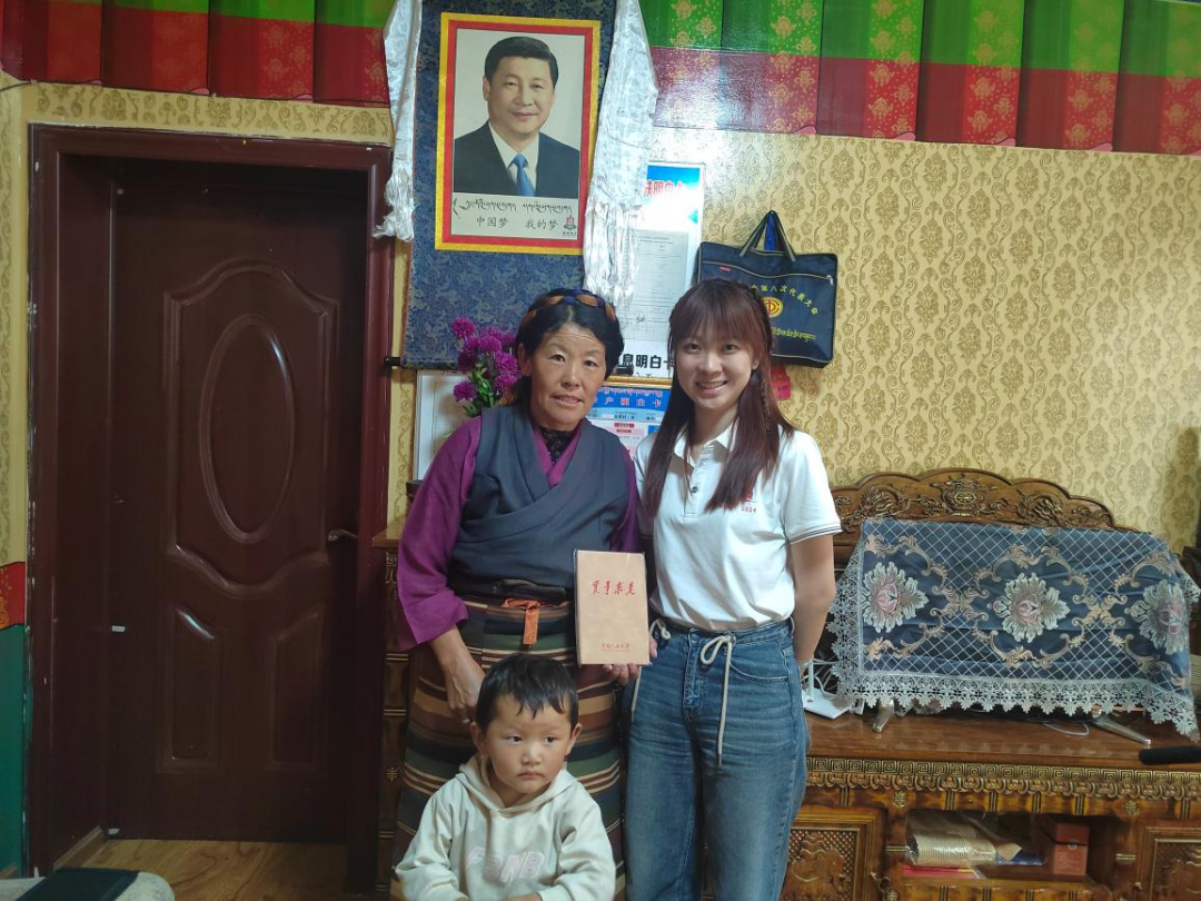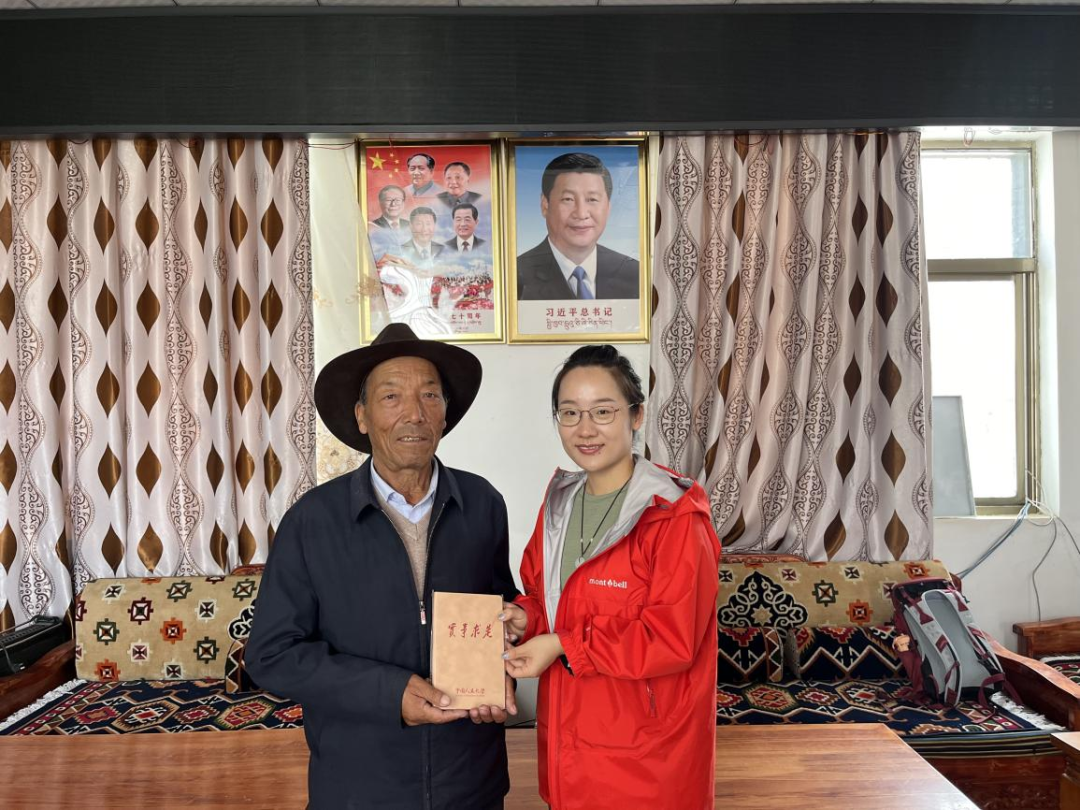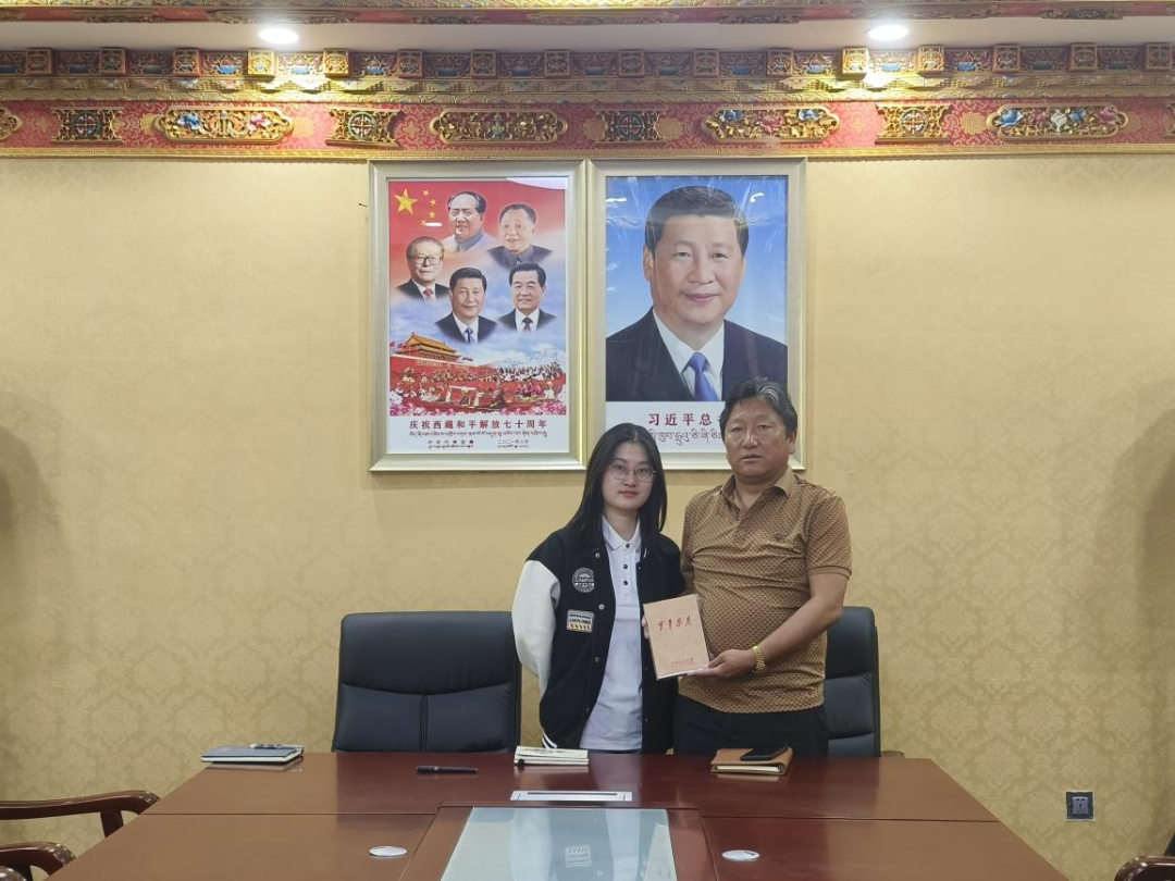 ▲西藏大学经济与管理学院硕士生任文丽访谈扎囊县原扶贫办主任罗永忠并合影留念