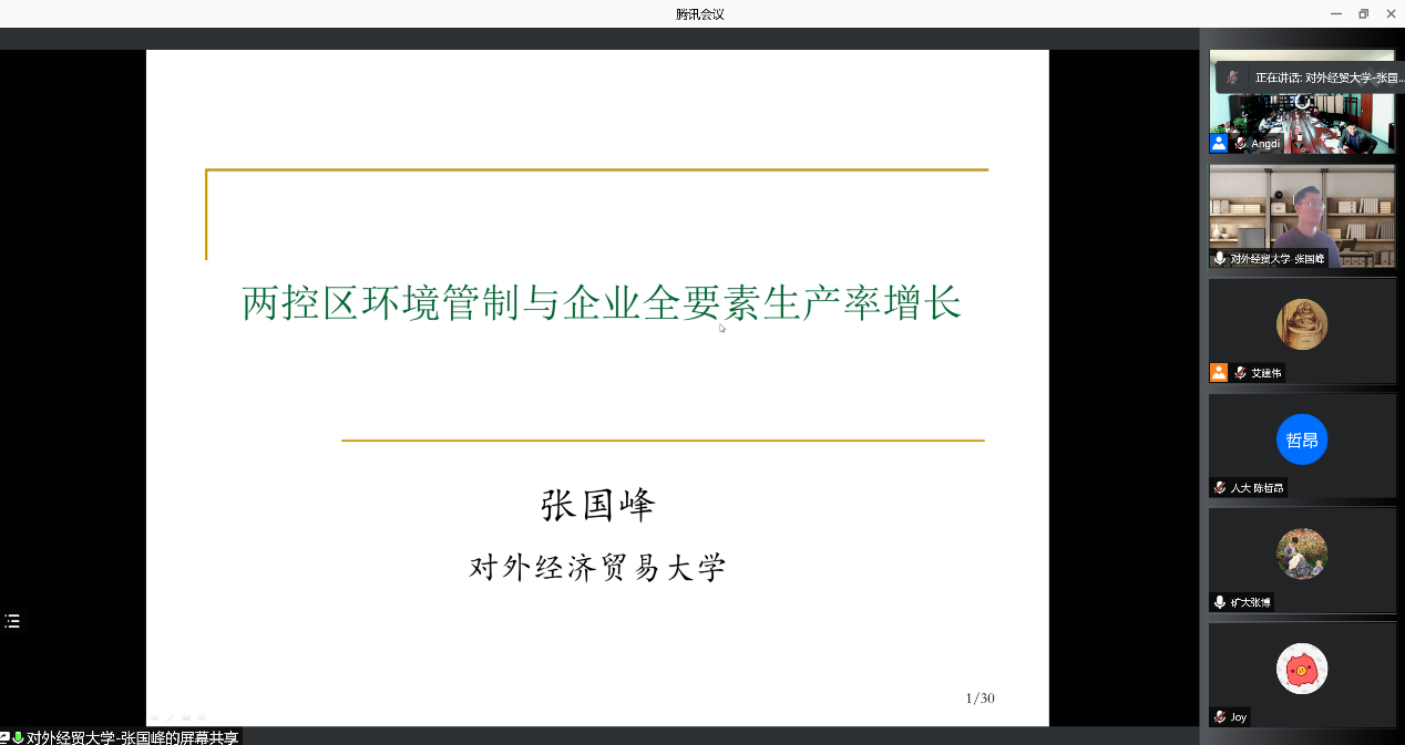 对外经济贸易大学国际经济贸易学院副教授张国峰以《两控区环境管制与企业全要素生产率增长》为题,刻画了企业全要素生产率的断尾特征和移动-伸缩特征,利用“无条件分布特征—参数对应”的分析方法,系统地考察了两控区环境管制对企业全要素生产率的影响。研究发现,两控区内企业生产率增长幅度显著低于非两控区,表明两控区环境管制通过提升生产成本阻碍了企业生产率的增长。另外,两控区内低生产率企业淘汰比例更高,从而提升了区内平均生产率水平。异质性分析发现,两控区政策对生产率的影响主要集中在高研发密集度与高污染行业、政策执行力较强和经济发展较快的地区,地区集聚经济有助于缓解该政策的负效应。