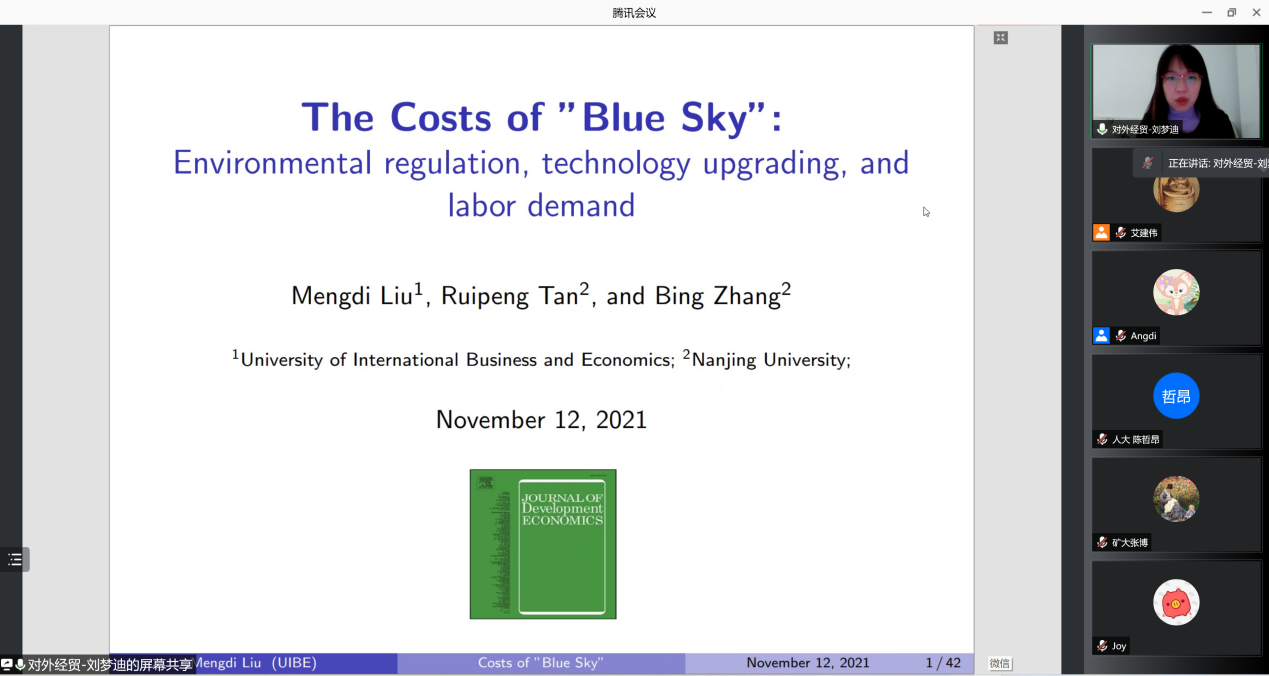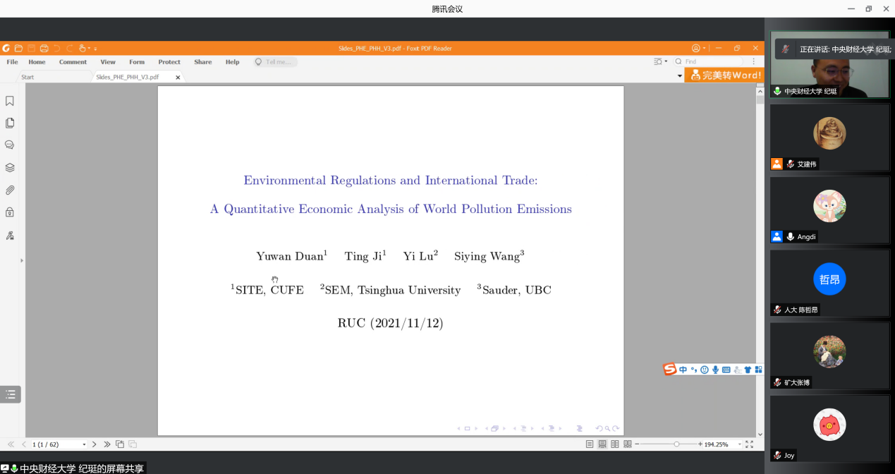 中央财经大学国际经济与贸易学院副教授纪珽以《国际贸易和世界污染排放:一个量化贸易的视角》为题进行了展示。该研究将污染作为生产的副产品纳入一般均衡贸易模型,并考虑了生产过程中投入产出联系,以此对国际贸易、环境和环境规制的相互关系进行量化研究。报告以污染避难所假说(Pollution Haven Hypothesis, PHH)和污染避难所效应(Pollution Haven Effect, PHE)之间的关系开始,通过理论模型构建和基于全球数据的结构模型估计,发现污染避难所效应(PHE)确实存在,但并没有发现污染避难所假说(PHH)存在的证据,即环境规制对国际分工和产业转移的作用有限。进一步的分析发现,即使将环境政策视为受贸易自由化影响的内生变量时,前文的主要结论不变。最后,贸易自由化的收入效应增加了世界污染的排放,生产率水平和贸易成本很大程度上决定了国家间贸易的分工,因此盖过了污染避难所效应。