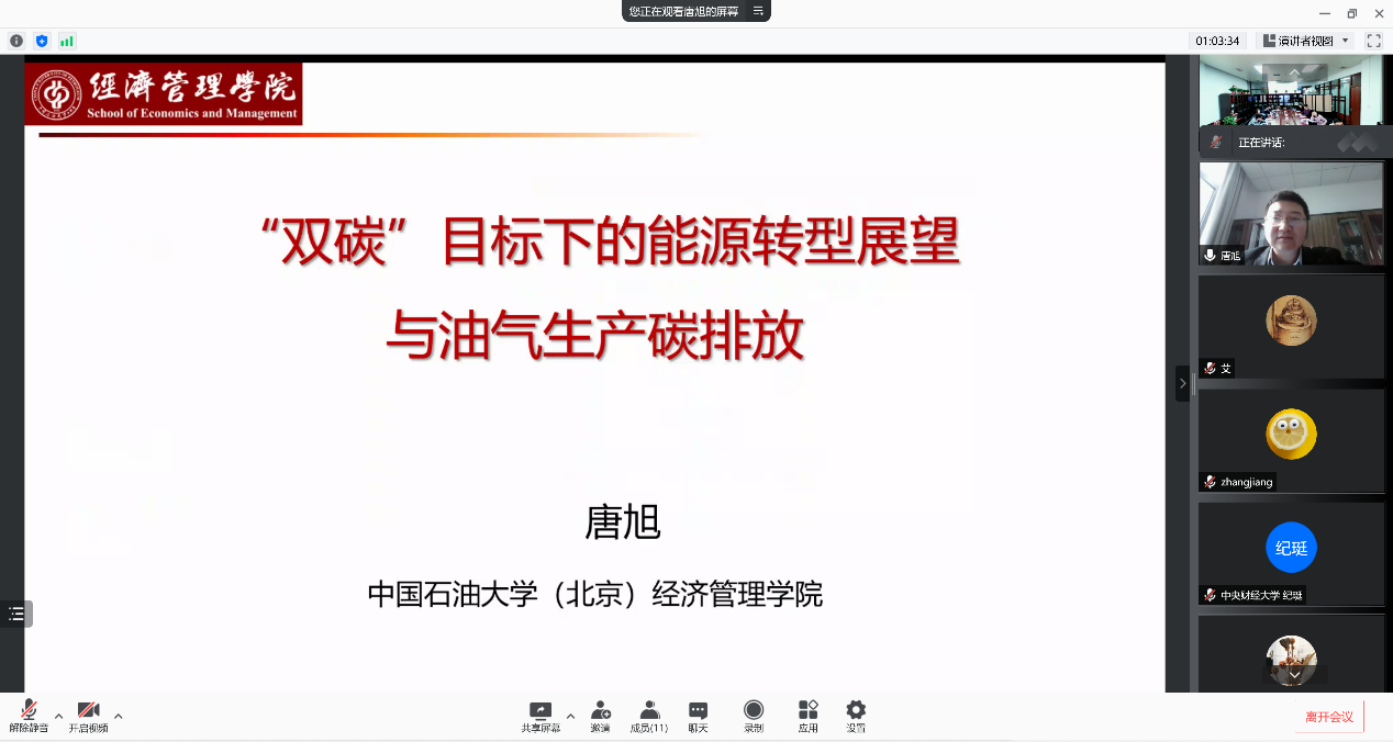 中国石油大学(北京)经济管理学院院长唐旭以《“双碳”目标下的能源转型展望与油气生产碳排放》为题进行汇报。研究认为,我国实现碳达峰、碳中和目标具有路径可达性,但面临巨大挑战。碳中和情景下,实现路径需要经历煤、石油达峰,天然气消费达峰以及化石能源消费急剧下降,形成可再生能源为主导的能源系统。在此期间,应注意协同管理油气资源开发中的产量与生产碳排放,持续关注不同油气生产排放的异质性,优化油气资源开发结构。