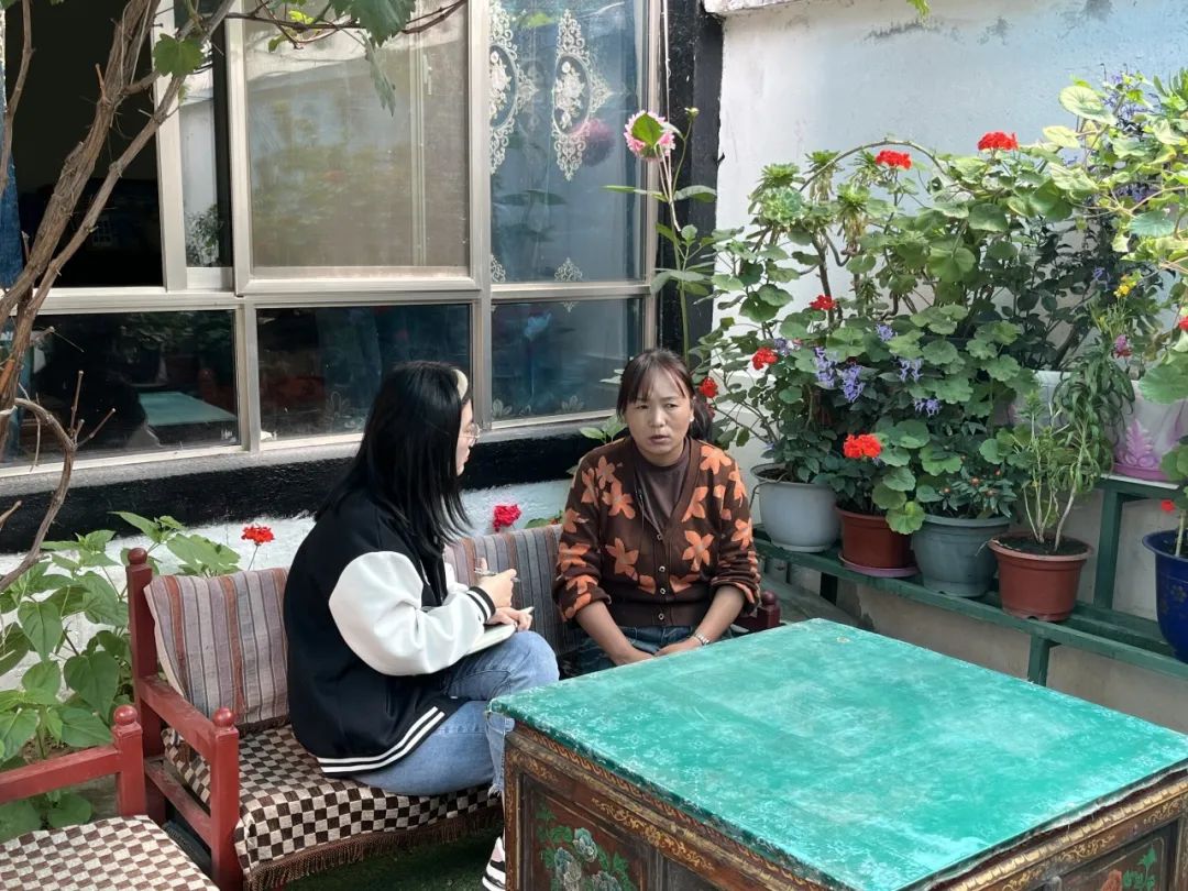 ▲西藏大学经济与管理学院硕士生任文丽访谈三有村脱贫户代表普珍