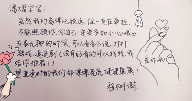 亲爱的水水~虽然疫情艰苦,但愿你的生活很甜。我带着甜甜的糖果给你加油,昂首看那边,胜利就在前面!——吴雨桐