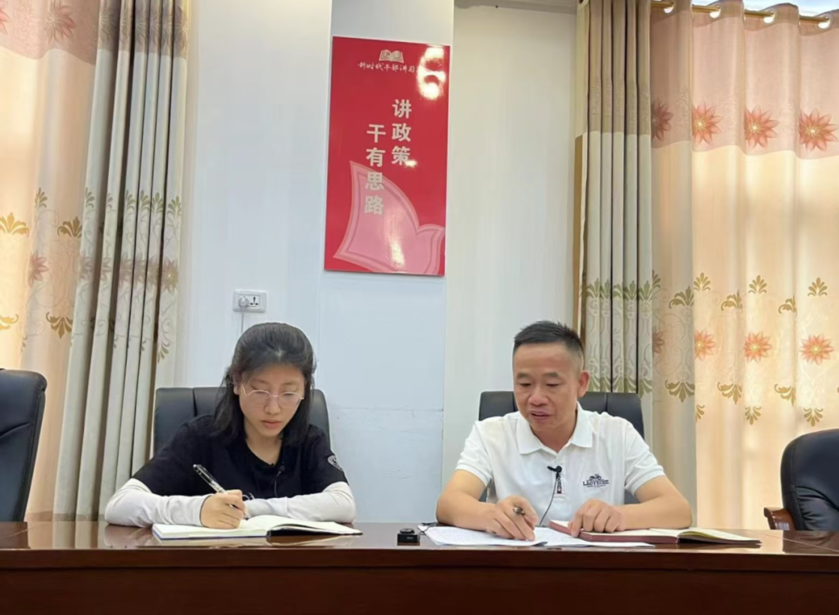 ▲中国人民大学本科生杜奕彤访谈敦寨镇党委书记舒刚