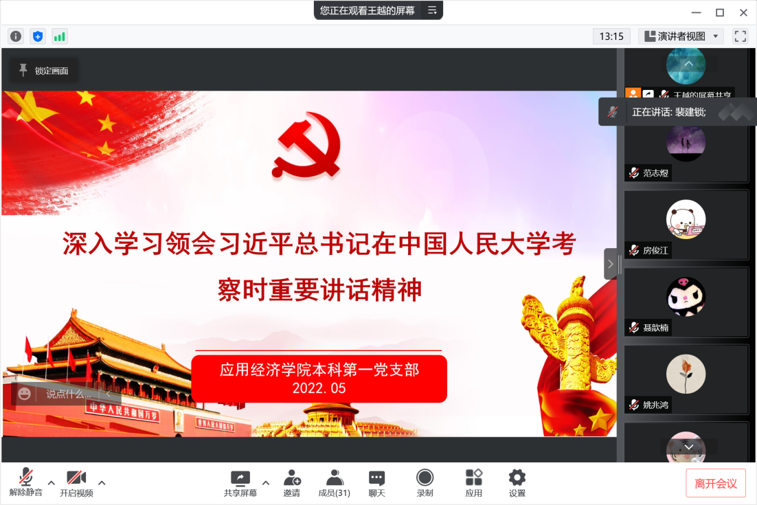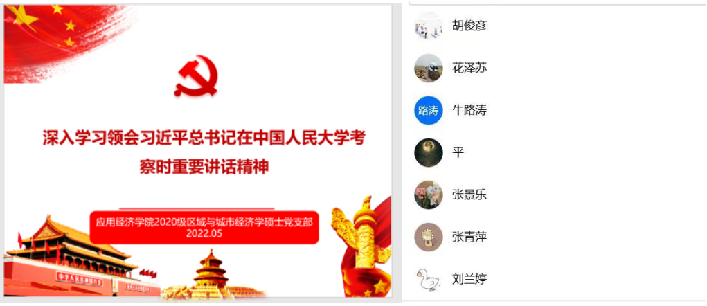 4月25日,习近平总书记来到中国人民大学考察调研,并发表重要讲话。探花视频 第一时间开展各类学习活动,组织全体党员观看新闻联播,学院党委理论学习中心组开展专题学习,组织党支部参观学校博物馆专题展览、广泛动员党员撰写学习心得等。按照学校统一部署,5月10日前,探花视频 全体党支部召开专题学习活动,学习领会习近平总书记在中国人民大学考察时重要讲话精神。学院党委理论学习中心组成员均深入基层党支部,一级带着一级学,主动参加基层党支部专题学习活动,实现基层党支部宣讲、学习全覆盖,迅速掀起学习习近平总书记重要讲话精神的热潮。