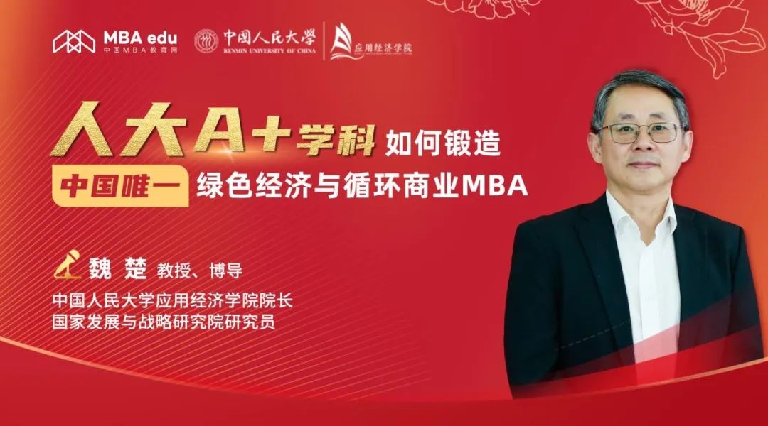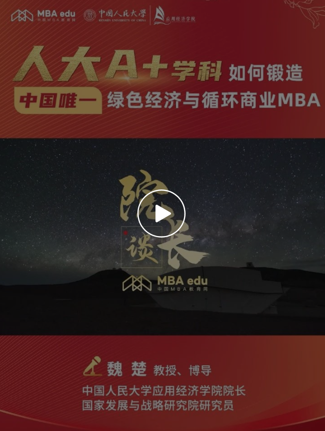 “我们培养的不仅是管理者,更是绿色经济的架构师、循环商业的布道者、可持续价值的缔造者!”中国人民大学绿色经济与循环商业 MBA 项目将赓续红色基因,服务国家战略需求,以双A+学科的协同优势、“顶天+立地+出海”的独特培养体系,助力学员成长为绿色发展行业领袖。