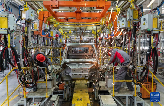 12月15日,工人在贵州省铜仁市万山区一家汽车制造企业的焊装车间作业。临近年末,各地企业开足马力赶制订单,力保完成全年生产任务。新华社发