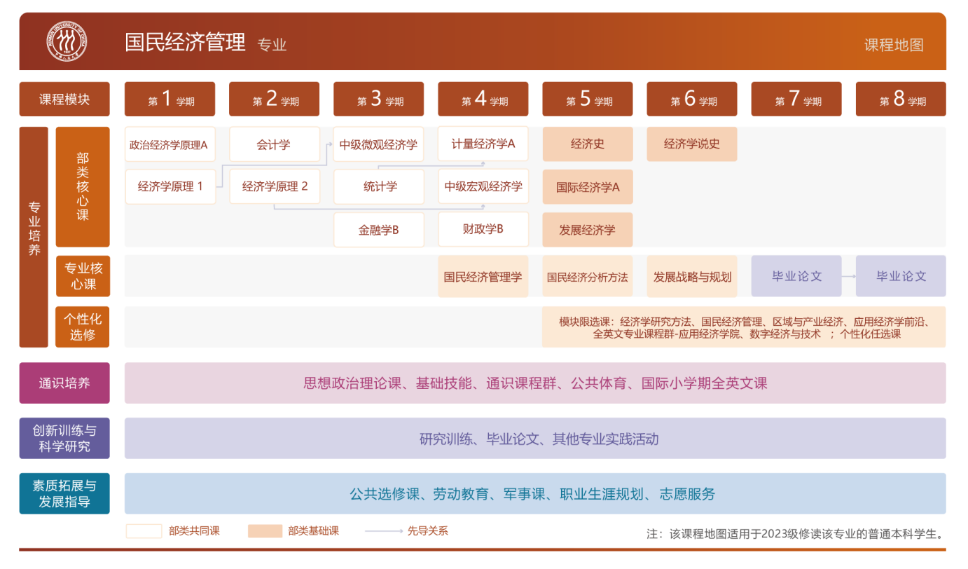 国民经济管理专业核心课程包括国民经济管理学、国民经济分析方法、发展战略与规划等。学院推动本硕博人才一体化培养,依托人工智能(AI)助力的知识图谱,实现本硕博知识与课程纵向贯通,为本科生升学就业打下扎实的基础。学院为学有余力的学生开设高阶荣誉课程,可在本科高年级阶段提前修读部分研究生水平的课程。
