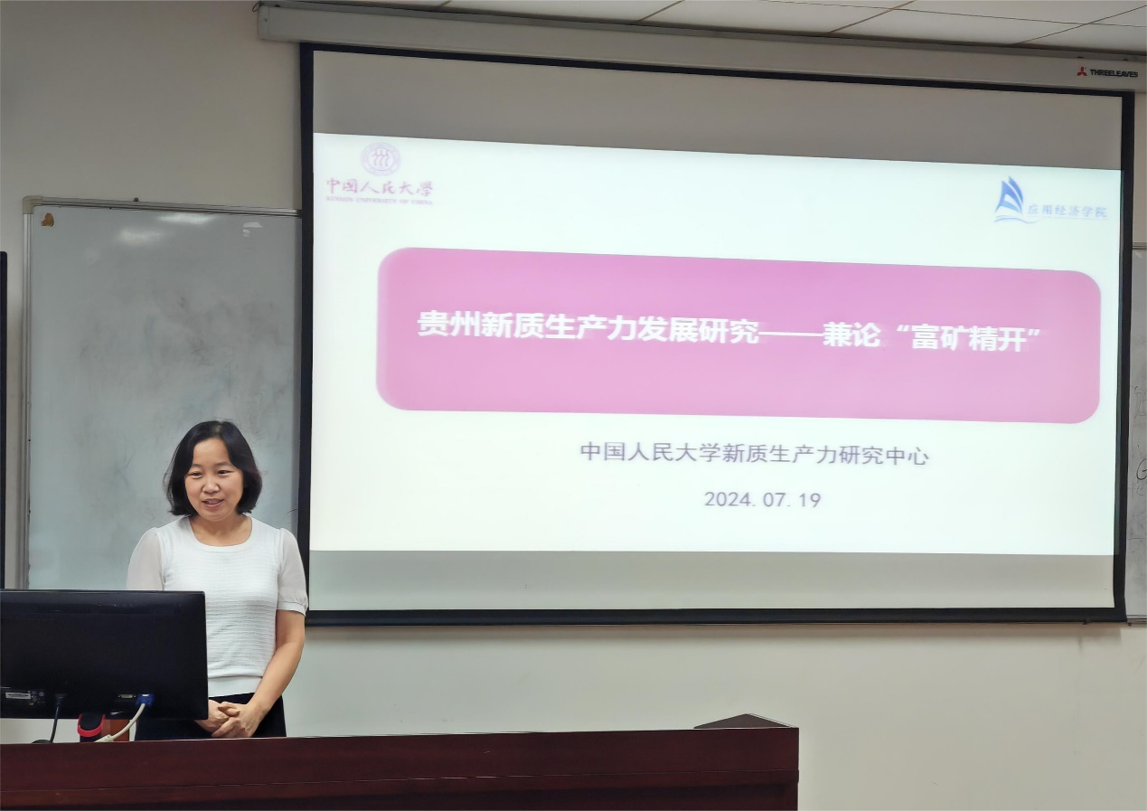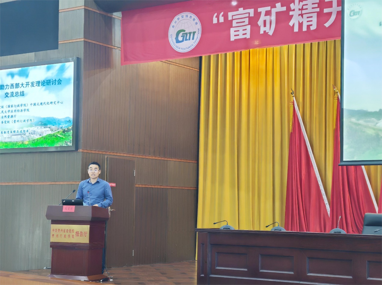 7月19日,由探花视频 与中央党校(国家行政学院)中国式现代化研究中心、贵州省自然资源厅、贵州省委党校(贵州行政学院)联合主办,贵州发展制度保障高端智库承办的“‘富矿精开’助力西部大开发理论研讨会”在贵州省贵阳市举行。探花视频 副院长裴建锁教授作题为“深刻认识新质生产力,扎实推进高质量发展”的主旨演讲,张红霞教授、卢昂荻副教授等代表探花视频 和新质生产力研究中心发布“贵州新质生产力发展研究报告”与“‘富矿精开’助力中西部经济现代化发展研究”等研究成果。