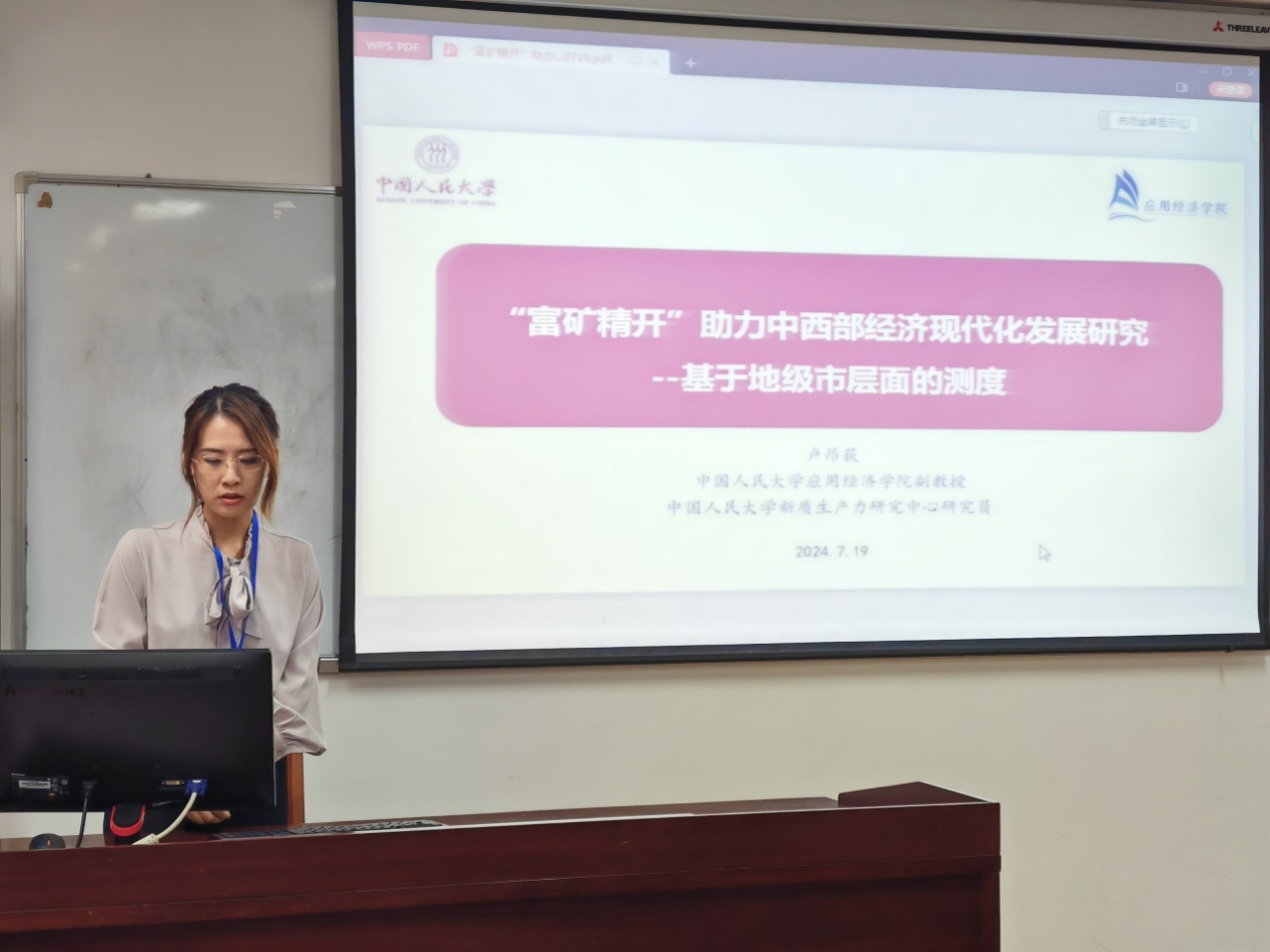 会议期间,卢昂荻还代表中国人民大学新质生产力研究中心发布中西部经济现代化发展课题组阶段成果“‘富矿精开’助力中西部经济现代化发展研究”报告。报告首先概述经济现代化的理论内涵,从经济产出、创新驱动、经济效率、人力资本以及社会资本等五个维度构建中西部经济现代化发展评价指标体系,测度发展指数,评估中西部经济现代化发展水平,在此基础上,刻画贵州省经济现代化版图,并分析“富矿精开”战略在创新驱动与经济效率等维度助力贵州省经济现代化发展的具体实现路径。