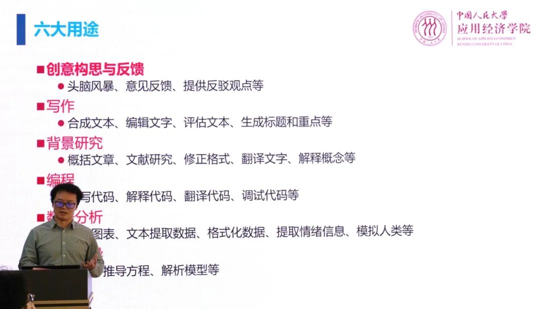 孙频围绕“生成式AI在经济学中的运用”,讲授了生成式AI在经济学领域的六大应用场景:创意构思与反馈、写作、背景研究、编程、数据分析和数学推导。此外,他还讲解了高效使用生成式AI的五大方法,强调提升提问能力的重要性。
