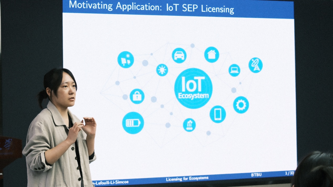 栗雅欣报告了论文“Licensing for Ecosystems”,研究围绕生态系统专利许可定价展开,以华为向日本中小企业收专利费、高通跨领域布局等作为案例,指出当一项专利涉及多个互补产品时,垄断性的生态系统定价可能比零定价带来更高的社会福利。当存在多个互补平台时,会导致“专利费堆叠”,但这可能反常地降低某些设备的总价格。张凡进行了点评,他建议进一步研究专利定价策略对厂商创新策略的驱动作用,以及该创新策略进而推动厂商生态网络发展并影响市场的反向趋势。