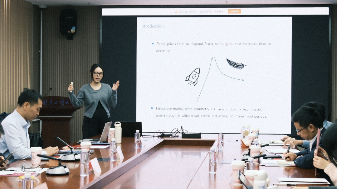 吕媛报告了论文“Asymmetric Pass-Through and Competition”,该文以希腊2010年三次消费税上升和2012年一次消费税下调为外生成本冲击,选取37个具有独立市场特征的希腊岛屿为研究场景,通过双重差分法等方法,探究零售汽油市场的非对称价格传导现象及竞争的影响。结果发现:零售价格对消费税上升的传导更快,对消费税下调的传导更慢;竞争加剧了税收上升时的价格传递,但对税收下降时的传递没有影响;消费者搜索行为是这一现象的关键驱动机制,而非共谋。王爱萍进行了点评,她建议系统地将结果与现有理论进行对话,说明本文在何种程度上推进了搜索成本这一理论机制的解释,并明确竞争的度量。