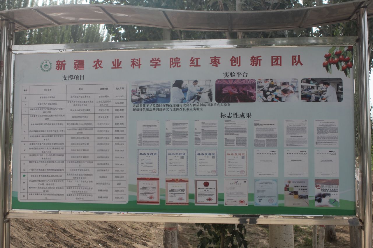 访谈团一行来到麦盖提县央塔克乡红枣特色小镇,参观了新疆红枣产业技术体系塔西综合试验站(麦盖提)科研示范基地与红枣种质资源圃。“新疆红枣产业技术体系”是自治区党委组织部人才办于2020年底首批启动的发挥人才引领作用的推进林果提质增效试点工作。在创新方向方面,目前研究团队主要从宏观(气象)、中观(枣园)和微观(微生物)开展枣果品质形成与调控研究,而且在红枣培育的引进、选育、培育和推广的每一阶段都会邀请国内不同领域的专家团队来研究调查,紧紧围绕新疆红枣全产业链一体化发展进行技术创新。而且,研究团队还基于云平台与大数据分析,构建新疆红枣流通与产业布局的决策智库,充分发挥新疆红枣产业的“品牌效应”。在人员方面,在基地工作的既有来自于浙江大学、西北农林科技大学、新疆林科院等地的技术团队,也有来自于新疆沙漠枣业有限公司、刀郎果农农副产品有限公司的专家,力图从理论到应用进行全方位技术钻研与突破。在资金方面,创新团队已获得多项国家级,省(自治区)级的科研课题,项目周期在1—5年不等,充分体现了农业研究的周期性;研究团队也已发表多项论文与专利,并进行技术创新、集成和示范推广,为广大企业与农户提供应急与咨询服务。