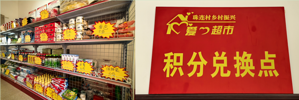 ▲珠连村爱心超市积分兑换点挂牌与内景