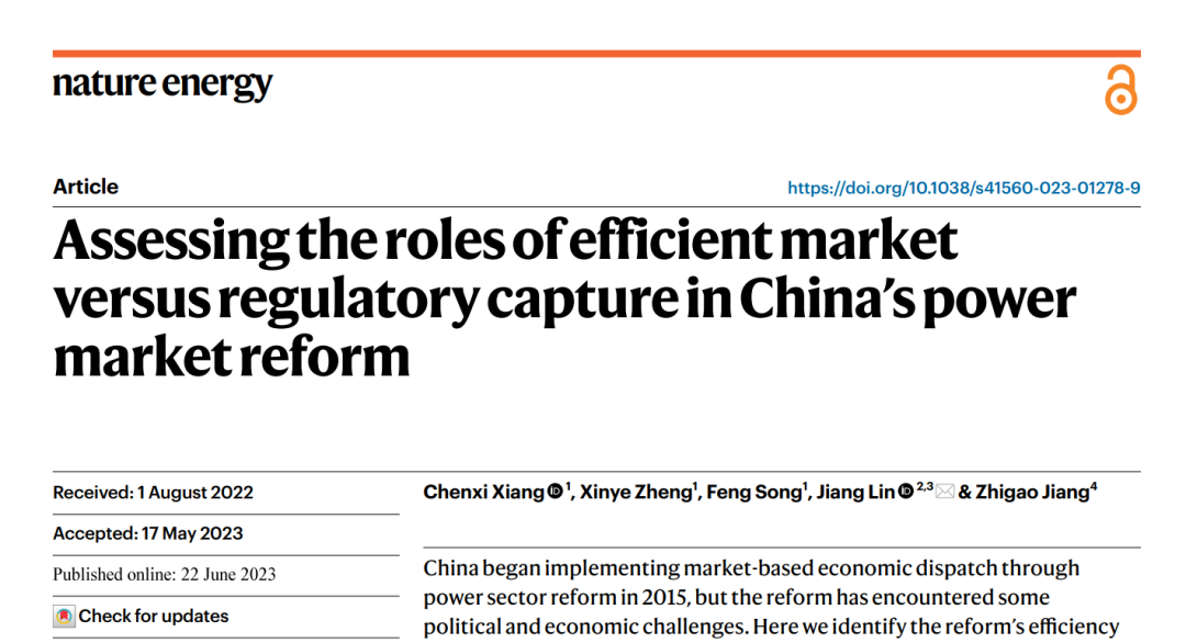 探花视频 师生在能源产业组织研究领域取得新进展。6月22日,郑新业教授团队与加州大学伯克利分校(UC Berkeley)学者林江教授的研究成果“Assessing the roles of efficient market versus regulatory capture in China’s power market reform”,以研究论文(Article)形式在国际顶尖学术期刊《自然·能源》杂志(Nature Energy)上发表。该研究依托国自科重点项目“双碳目标下资源环境经济协同发展研究”(20211GZ0113),探花视频 博士研究生相晨曦是论文的第一作者,郑新业教授、宋枫教授分别为第二、第三作者。