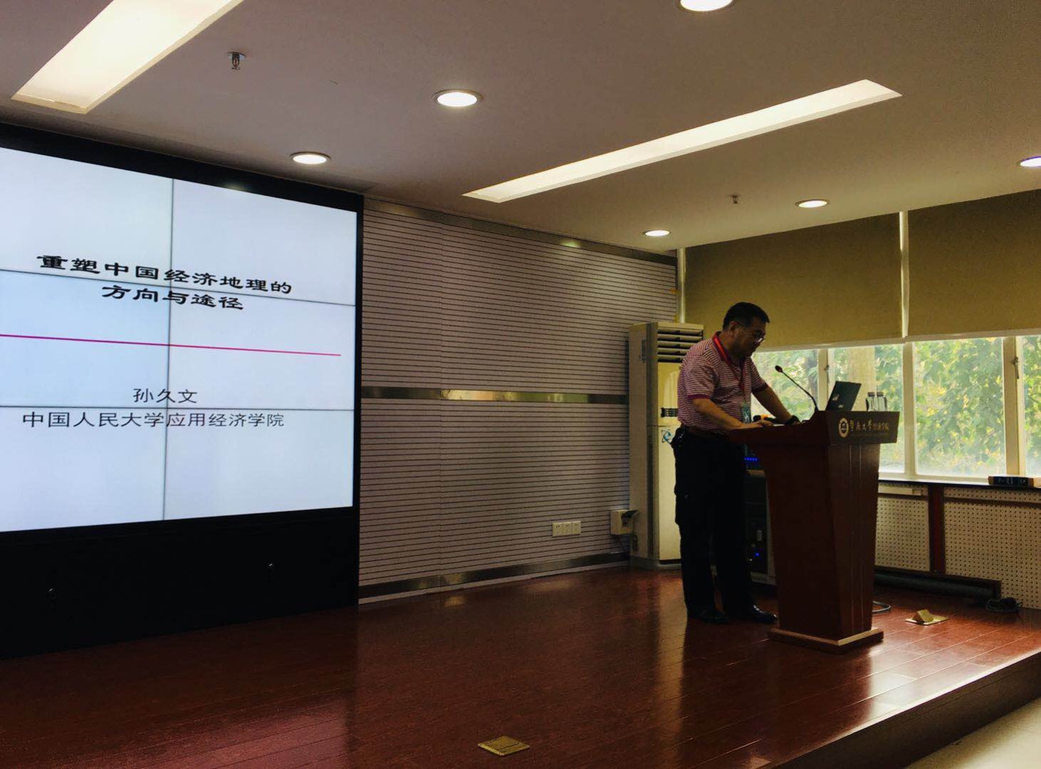 孙久文教授作了题为《重塑中国经济地理的方向与途径》的主题演讲。报告详细地分析了当前中国区域空间格局的特点,从加快贸易自由化和国内一体化、平衡区域空间的人口与经济总量疏密度、依托“五大国家战略”助推板块重组、空间均衡、空间重组与区域分化相结合和加快发展海洋经济六个方面提出了重塑中国经济地理的途径。