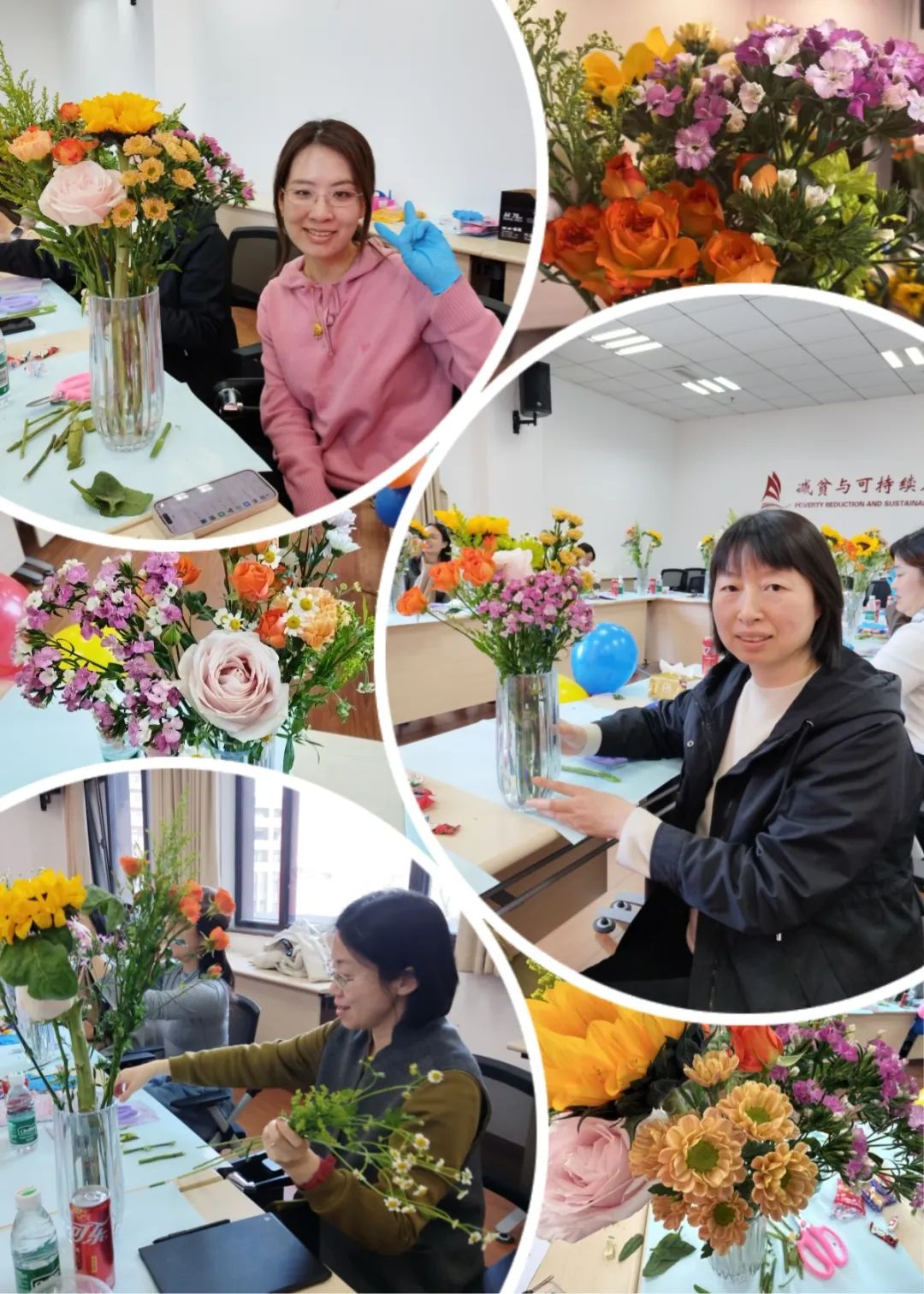 在实际操作环节,女教职工们化身“花艺设计师”,纷纷拿起剪刀和鲜花,充分发挥创造力与想象力,精心设计属于自己的花艺作品。大家相互交流、互相帮助,现场欢声笑语不断。经过一个多小时的努力,一瓶瓶色彩斑斓、独具匠心的花束在她们手中诞生。