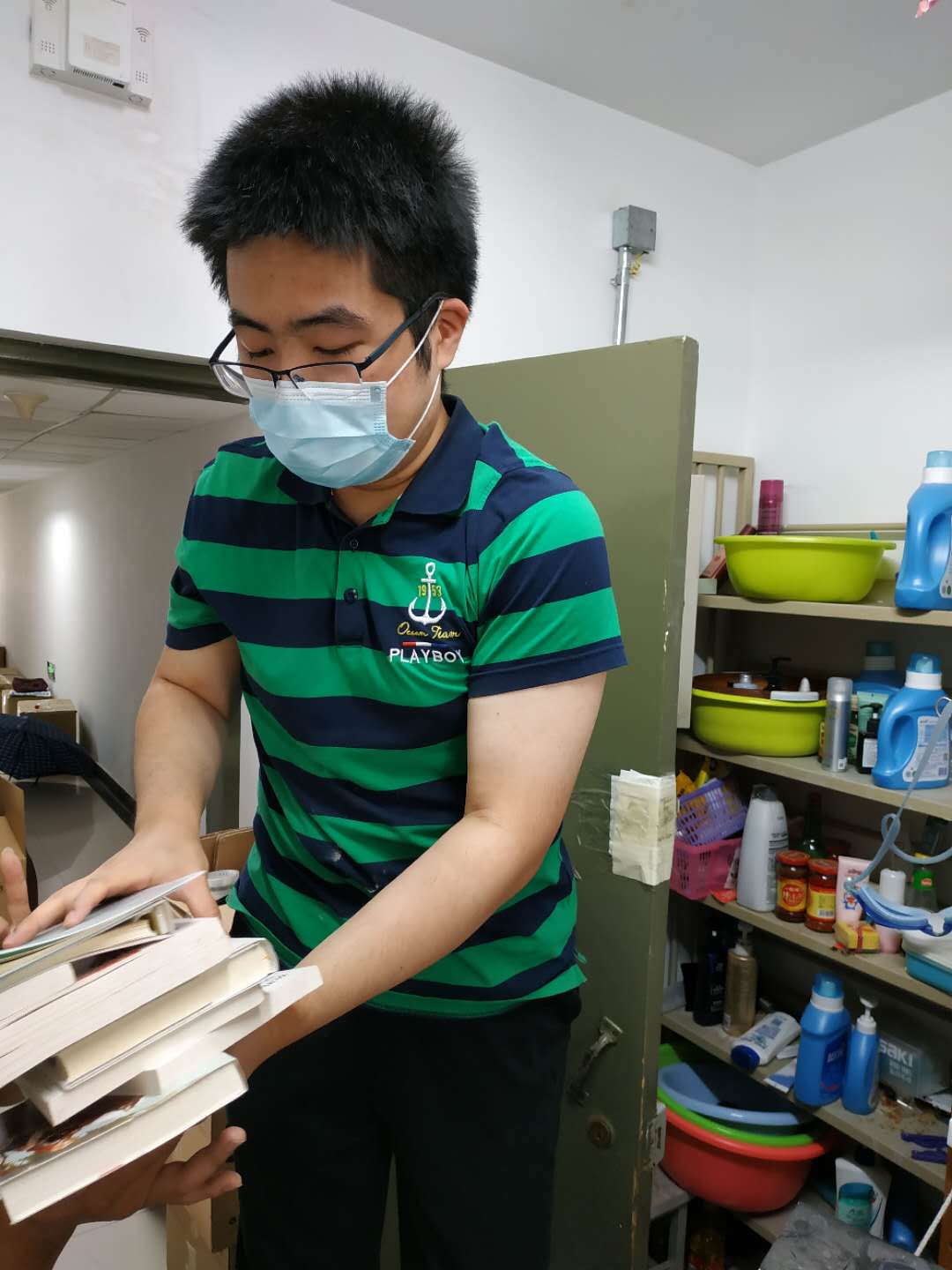 博士生志愿者孙九伦、硕士生志愿者陈卓、本科生志愿者梁云淞、王红英在打包整理书籍与日用品