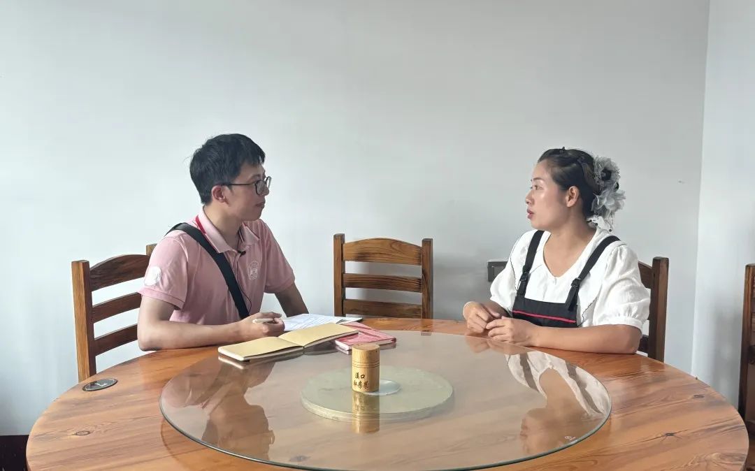 随后,博士生樊昊达对溪口村脱贫户石桂香展开了访谈。石姐介绍自家一家五口在脱贫前仅靠其丈夫务农的收入维持生活,不仅收入低还不稳定。在开展脱贫攻坚后,村内以就业为导向,大力发展旅游业,为她提供了打扫卫生的工作岗位,让她不用外出打工,能一边带孩子一边挣钱;村内还提供技术培训,她丈夫在学习了水电安装技术后,家中收入快速提高,真正实现了精准帮扶。随着村中旅游业的快速发展,她在驻村第一书记的建议下,依靠自家在村口的优越位置,凭借自己高超的厨艺,开办了“溪口村私房菜馆”。随着村内配套设施的完善,游客越来越多,她的生意也越做越好,日子越过越红火。